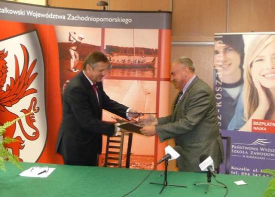 Marek Hok - członek zarządu województwa oraz prof. Waldemar Żarski - rektor PWSZ podczas uroczystości przekazania