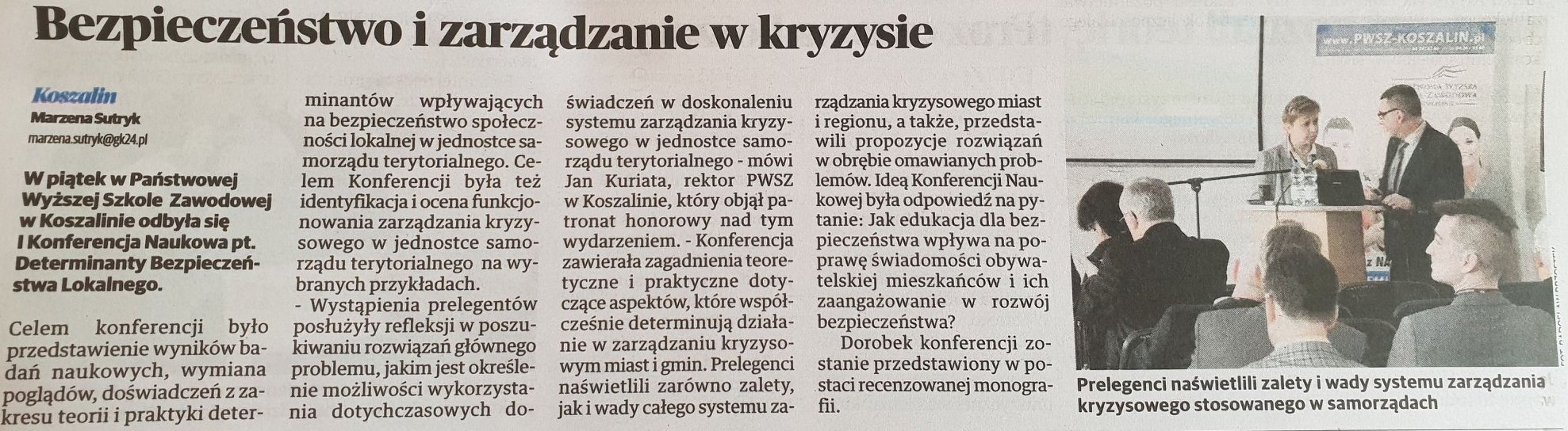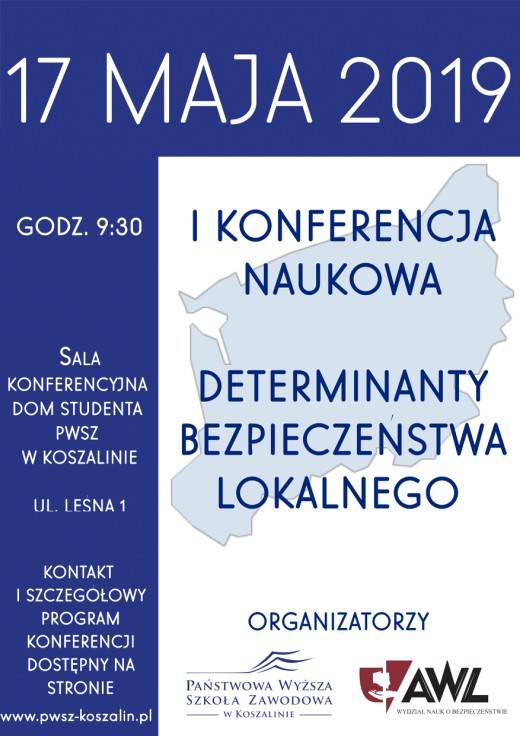 17 maja 2019r. w siedzibie PWSZ w Koszalinie odbyła się I Konferencja Naukowa pt. Determinanty Bezpieczeństwa Lokalnego. Celem konferencji było przedstawienie wyników badań naukowych, wymiana poglądów, doświadczeń z zakresu teorii i praktyki determinantów wpływających na bezpieczeństwo społeczności lokalnej w jednostce samorządu terytorialnego. Celem Konferencji była też identyfikacja i ocena funkcjonowania zarządzania kryzysowego w jednostce samorządu terytorialnego na wybranych przykładach. Wystąpienia prelegentów posłużyły refleksji w poszukiwaniu rozwiązań problemu głównego, jakim jest określenie możliwości wykorzystania dotychczasowych doświadczeń w doskonaleniu systemu zarządzania kryzysowego w jednostce samorządu terytorialnego.