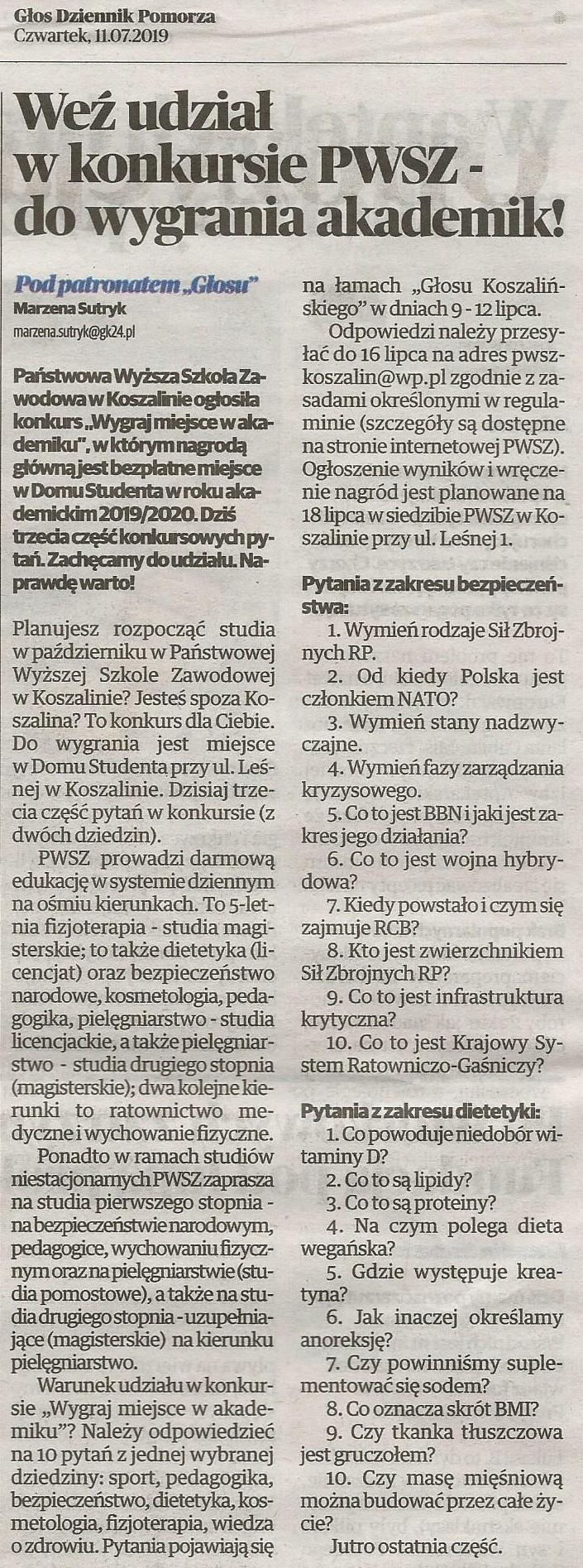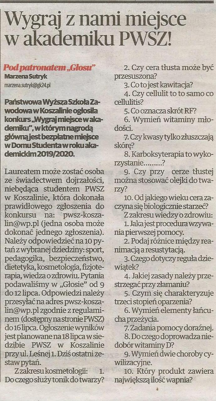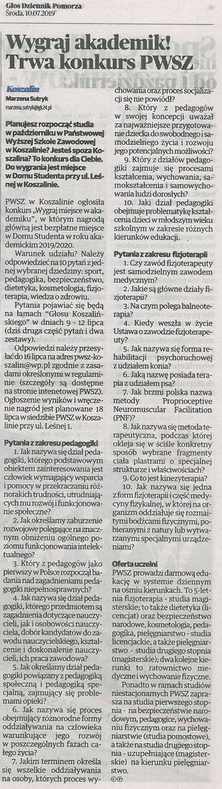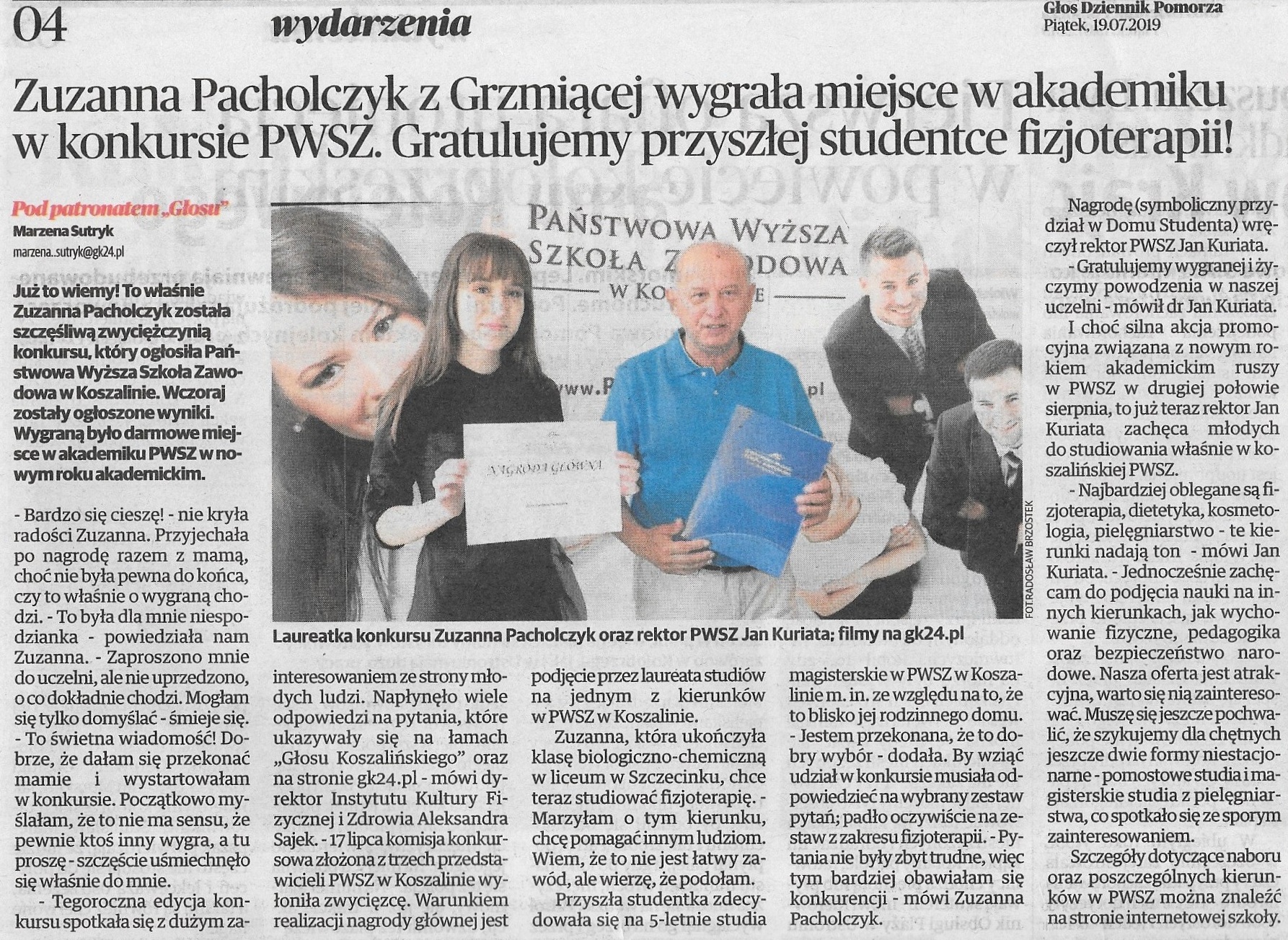 Znane już są wyniki Konkursu „Wygraj miejsce w Akademiku”, organizowanego po raz kolejny przez Państwową Wyższą Szkołę Zawodową w Koszalinie. Konkurs adresowany był do przyszłych studentów Uczelni, a nagrodą było bezpłatne miejsce w Domu Studenta PWSZ w Koszalinie na okres od 1 października 2019 do 30 czerwca 2020. Tegoroczna edycja konkursu spotkała się z dużym zainteresowaniem ze strony młodych ludzi. Napłynęło wiele odpowiedzi na pytania, które przez cztery kolejne dni ukazywały się na łamach Głosu Koszalińskiego. Lauretem konkursu została Zuzanna Pacholczyk, mieszkanka Grzmiącej, która bezbłędnie odpowiedziała na pytania z zakresu fizjoterapii. Pani Zuzanna będzie studentką 5-letnich studiów magisterskch na kierunku fizjoterapia w PWSZ w Koszalinie. 18 lipca Laureatka Konkursu otrzymała główną nagrodę z rąk Rektora PWSZ w Koszalinie, dr. Jana Kuriaty.