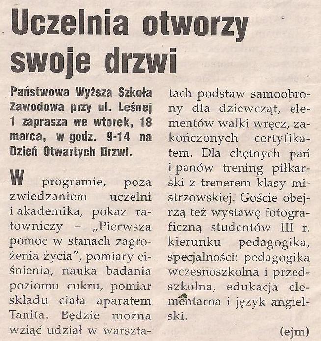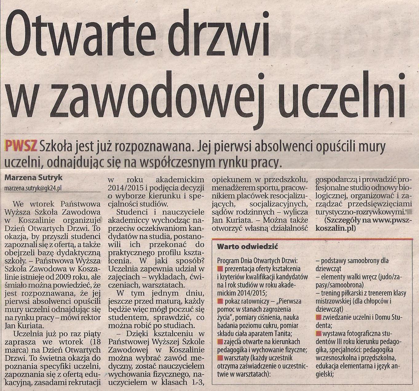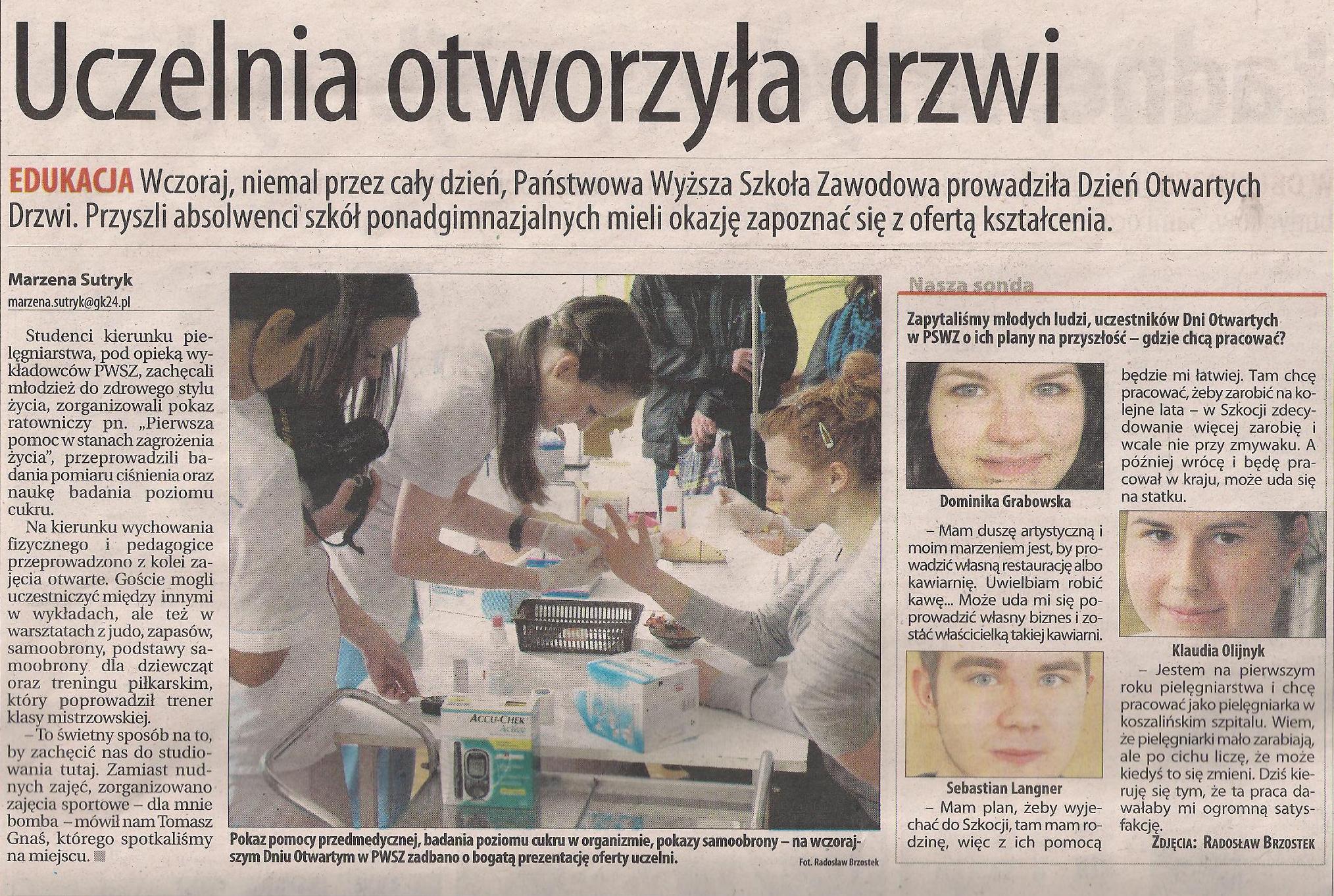5) Otwarte drzwi w zawodowej uczelni - zapowiedź - "GK" z dn.15.03.2014r.