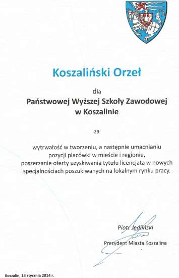 Nasza Uczelnia znalazła się w gronie laureatów dorocznej nagrody Prezydenta Miasta. Statuetka Koszalińskiego Orła została przyznana w dziedzinie - EDUKACJA