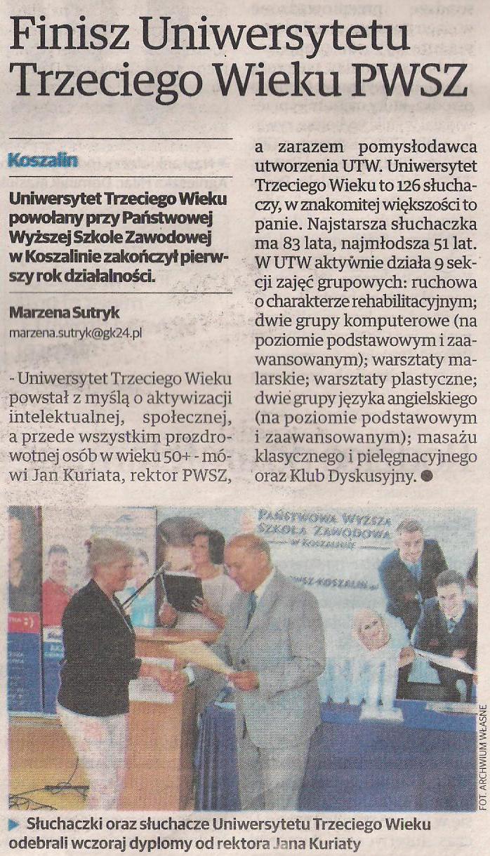 17.06.2015r. odbyło się uroczyste zakończeniu I roku działalności Uniwersytetu Trzeciego Wieku (UTW) przy Państwowej Wyższej Szkole Zawodowej w Koszalinie. UTW powstał z myślą o aktywizacji intelektualnej, społecznej, a przede wszystkim prozdrowotnej osób w wieku 50+. Pomysłodawcą utworzenia UTW w PWSZ w Koszalinie był Rektor dr Jan Kuriata. Uniwersytet Trzeciego Wieku liczy 126 Słuchaczy. W znakomitej większości, blisko 80 % Słuchaczy to panie. Najstarsza Słuchaczka ma 83 lata, najmłodsza 51 lat. Średnia wieku Słuchaczy to około 64 lata.
