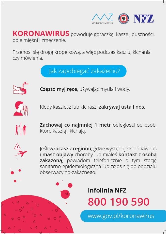 W związku z sytuacją występowania koronawirusa w Polsce, w trosce o wspólne bezpieczeństwo zdrowotne, apelujemy o przestrzegania zaleceń Państwowej Inspekcji Sanitarnej i stosowania się do wytycznych służb sanitarnych w zakresie kwarantanny i zasad higieny.