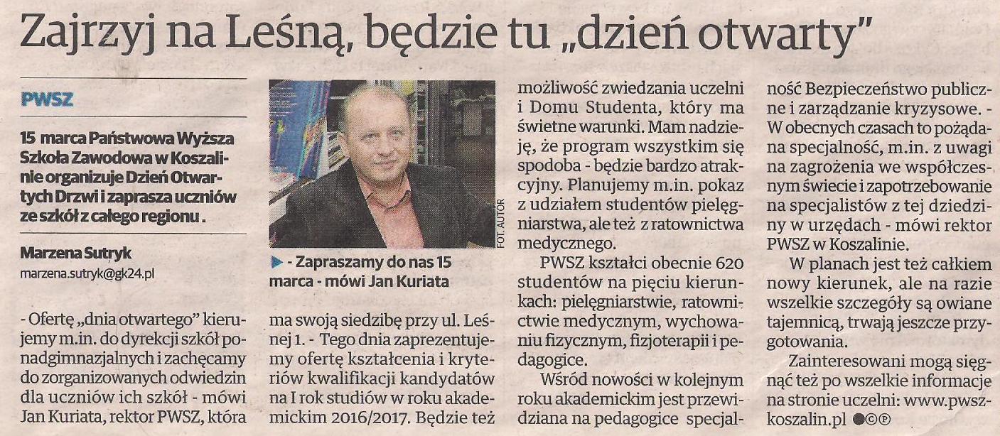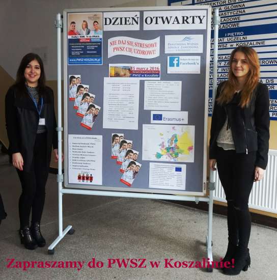 15 marca 2016r. PWSZ w Koszalinie zorganizowała Dzień Otwartych Drzwi. Podczas bezpośredniego spotkania ze studentami i kadrą wykładowców można było zapoznać się z szeroką ofertą edukacyjną Uczelni, zasadami rekrutacji w roku akademickim 2016/2017 oraz poznać perspektywy, jakie daje ukończenie poszczególnych kierunków studiów czy specjalności. W programie znalazło się również zwiedzanie uczelni i Domu Studenta.