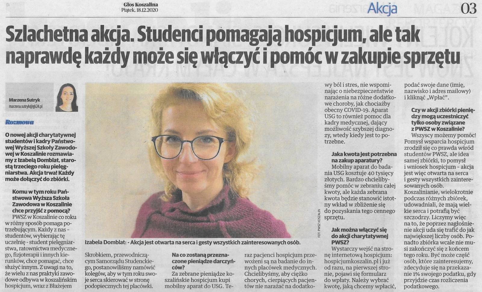Inicjatorką akcji jest starościna 3 roku pielęgniarstwa - Izabela Domblat, wywiad z inicjatorką akcji - gk24.pl - 18.12.2020r.
