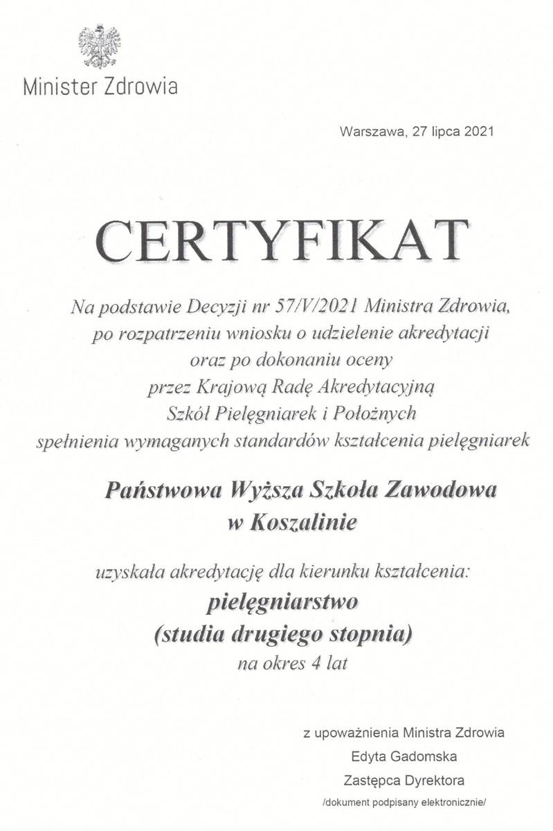 Realizowane z powodzeniem od ponad 10 lat kształcenie na kierunku pielęgniarstwo zostało w czerwcu poddane wnikliwej analizie przez Krajową Radę Akredytacyjną Szkół Pielęgniarek i Położnych. Sprawdzono jakość programów studiów, poziom kadry dydaktycznej i pomieszczeń technicznych w których odbywają się studia. Po napisaniu raportu KRASPiP, podjęła decyzję o spełnieniu przez PWSZ w Koszalinie wymaganych standardów nauczania pielęgniarek i pielęgniarzy. Rezultatem jest certyfikat wystawiony przez Ministra Zdrowia, który daje możliwość kształcenia kadr przez następne 4 lata.