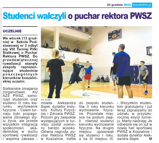 13 grudnia 2022 r. w gościnnych progach SP 3 w Koszalinie odbył się VII Turniej Piłki Siatkowej o Puchar Rektora PWSZ w Koszalinie. Do przedświątecznej rywalizacji stanęły zespoły reprezentujące studentów poszczególnych kierunków Uczelni. Siatkarskie zmagania zorganizowali KU AZS PWSZ w Koszalinie, Samorząd Studencki oraz studenci III roku kierunku wychowanie fizyczne (w ramach kształcenia w zakresie menedżer sportu i menedżer imprez sportowych).