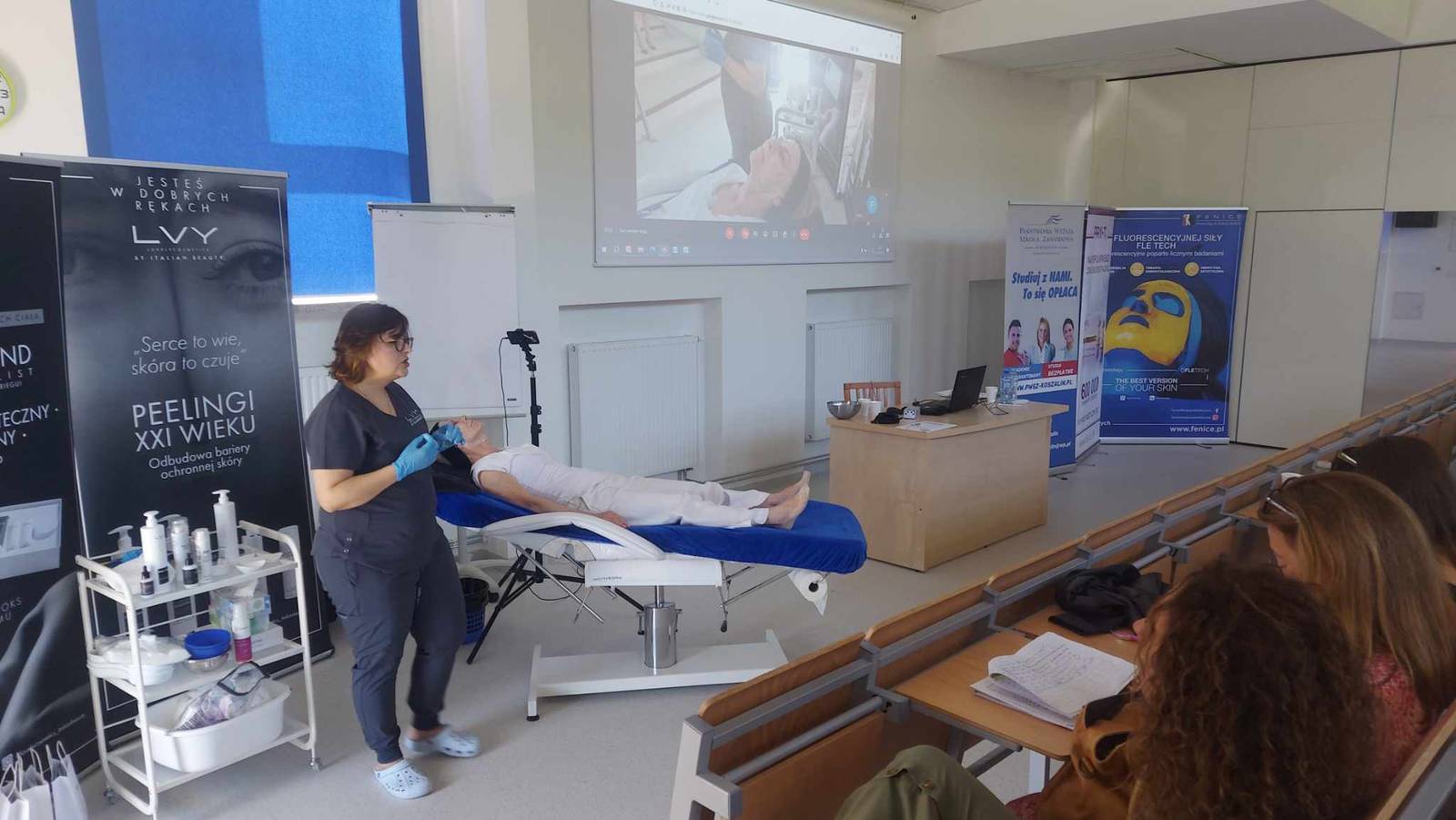 Elementem sympozjum był również pokaz profesjonalnych zabiegów przeprowadzonych przez mgr Monikę Michałowską, która podzieliła się swoim doświadczeniem i przekazała cenną wiedzę praktyczną. Zaprezentowała specjalistyczny zabieg odbudowujący barierę hydrolipidową HYRA WEAR oraz zabieg z wykorzystaniem niebieskiej diody LED FLUORESCENT LIGHT ENERGY. Była to doskonała okazja do obserwowania praktycznego podejścia do innowacyjnych zabiegów oraz poznania nowych technik pracy.