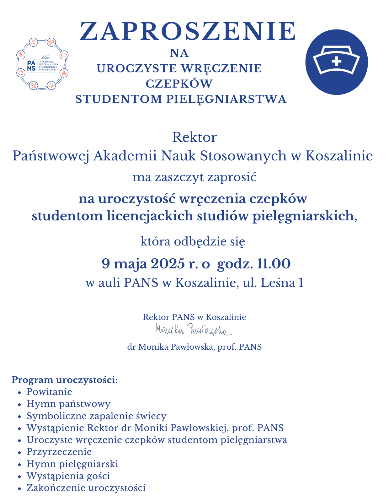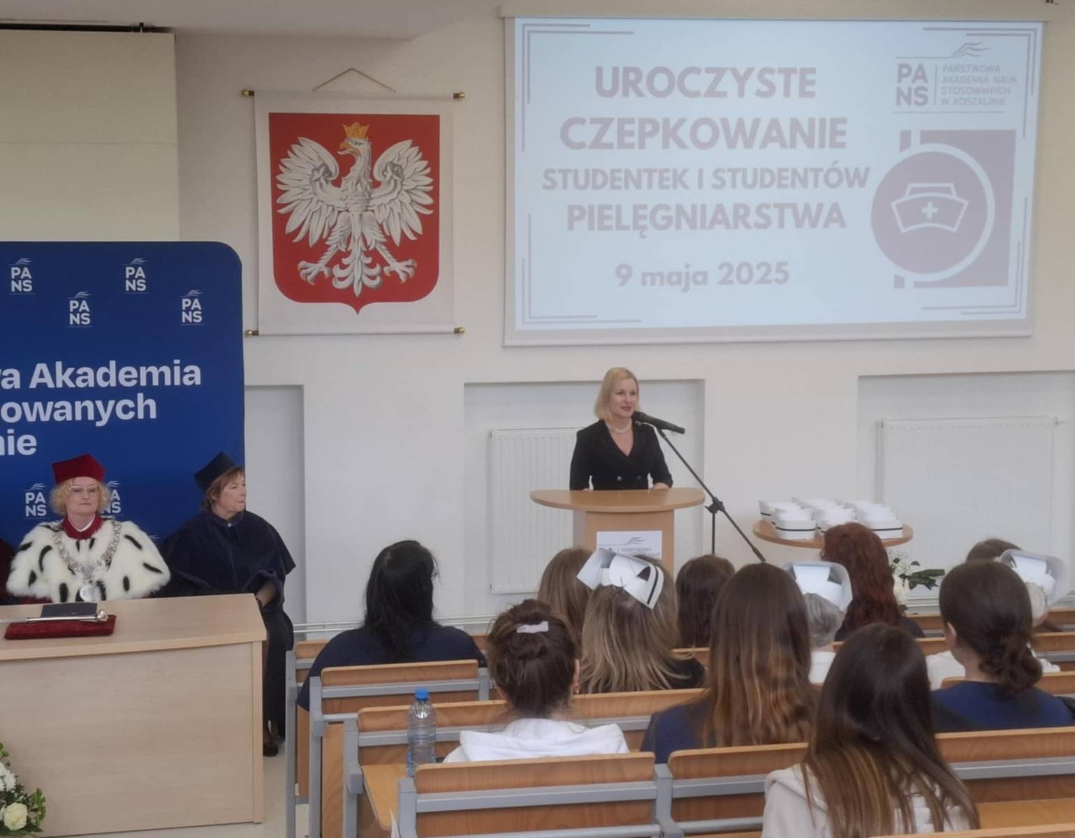 9 maja 2025r. w PANS w Koszalinie już po raz IX odbyło się uroczyste wręczenie czepków studentom 3 roku pielęgniarstwa, którzy symbolicznie dołączyli do grona pielęgniarek i pielęgniarzy.