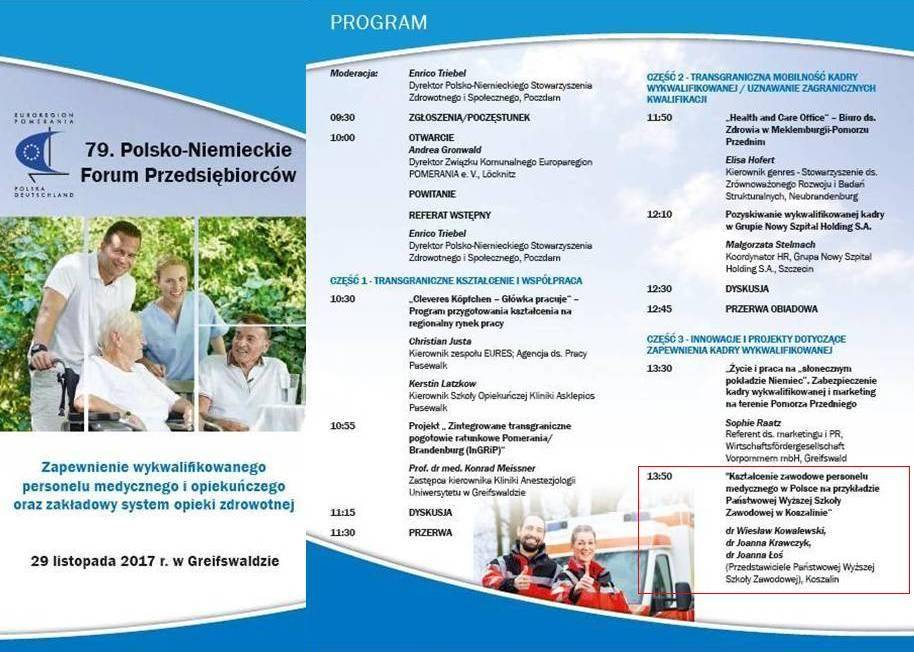 29 listopada 2017 studenci i wykładowcy kierunków fizjoterapia, pielęgniarstwo i ratownictwo medyczne wzięli udział w Polsko-Niemieckim Forum w Greifswaldzie zorganizowanym przez Kommunalgemeinschaft Europaregion POMERANIA we współpracy z Wirtschaftsfördergesellschaft Vorpommern mbH, Centra Usługowo-Doradcze Euroregionu POMERANIA w Greifswaldzie · Neubrandenburgu · Schwedt Strausbergu · Koszalinie · Karlinie · Myśliborzu · Dębnie. Debata dotyczyła: