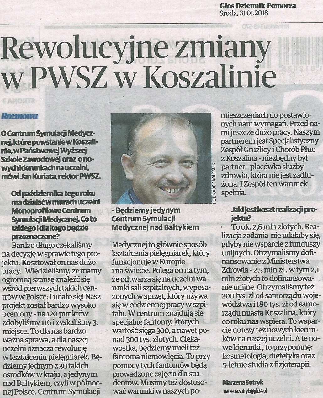 Centrum Symulacji Medycznej w PWSZ w Koszalinie - "Głos Koszaliński" z dn.31.01.2018