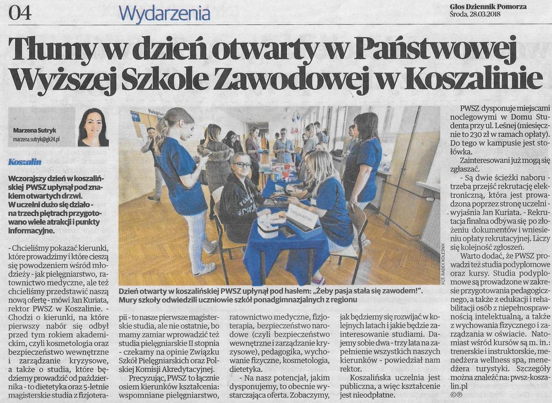 27 marca 2018r. PWSZ w Koszalinie zorganizowała Dzień Otwarty. Podczas bezpośredniego spotkania ze studentami i kadrą wykładowców można było zapoznać się z szeroką ofertą edukacyjną Uczelni, zasadami rekrutacji w roku akademickim 2018/2019 oraz poznać perspektywy, jakie daje ukończenie poszczególnych kierunków studiów czy specjalności. W programie znalazło się również zwiedzanie uczelni i Domu Studenta.
