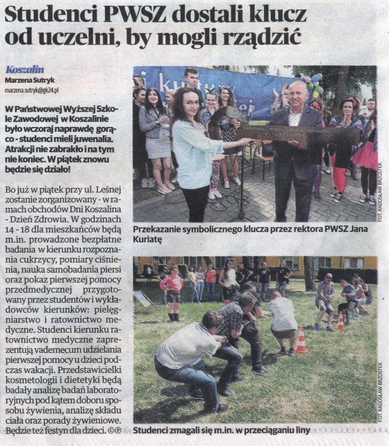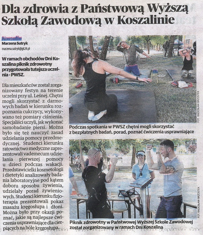 Przez organizację "Dnia zdrowia w PWSZ" uczelnia włączyła się w organizację corocznych obchodów Dni Koszalina. Na terenie uczelni wykonywane były nieodpłatne badania dla mieszkańców Koszalina w kierunku rozpoznania cukrzycy, pomiary ciśnienia, analiza składu ciała, nauka samobadania piersi przygotowane przez studentów pielęgniarstwa pod opieką wykładowców PWSZ. Studenci kierunku fizjoterapia prezentowali pokaz masażu kręgosłupa i dłoni. Przedstawicielki kosmetologii i dietetyki prowadziły analizę badań laboratoryjnych pod kątem doboru sposobu żywienia, analizę składu ciała oraz porady żywieniowe w różnych jednostkach chorobowych. Studenci kierunku pedagogika i wychowanie fizyczne zorganizowali festyn sportowy dla dzieci i dorosłych. A młodzież z kierunku bezpieczeństwo narodowe zaprezentowała naukę elementów samoobrony oraz pokaz "Jak reagować w warunkach zagrożenia terrorystycznego". Studenci kierunku ratownictwo medyczne zaprezentowali vademecum udzielania pierwszej pomocy dla zuchów Skrzydlate Bractwo, które uczestniczyły w zdobywaniu poszczególnych sprawności. Uczelnię odwiedzili także niepełnosprawni sportowcy ze Startu Koszalin współpracujący ze studentami i wykładowcami kierunku fizjoterapii. Osoby zainteresowane miały możliwość badania nowatorskim aparatem modelu elektrycznej pracy serca stanowiącego podstatwę analizy SATRO z systemem do wczesnej diagnostyki choroby niedokrwiennej serca, którego twórcą jest prof. Jerzy Stanisławski Janicki. Do zobaczenia za rok!