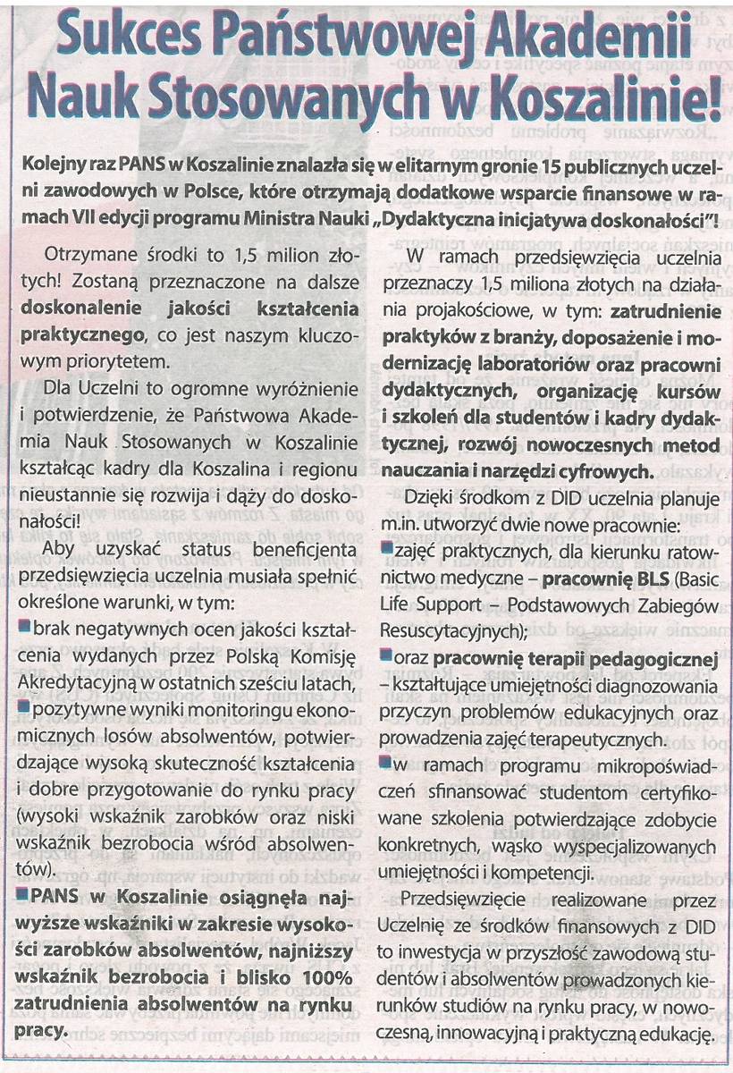 Państwowa Akademia Nauk Stosowanych w Koszalinie po raz 7. została laureatką programu „Dydaktyczna Inicjatywa Doskonałości” i otrzymała 1,5 milion złotych. Jest to program Ministra Nauki, którego celem jest wsparcie publicznych uczelni zawodowych w doskonaleniu jakości kształcenia na kierunkach studiów o profilu praktycznym.