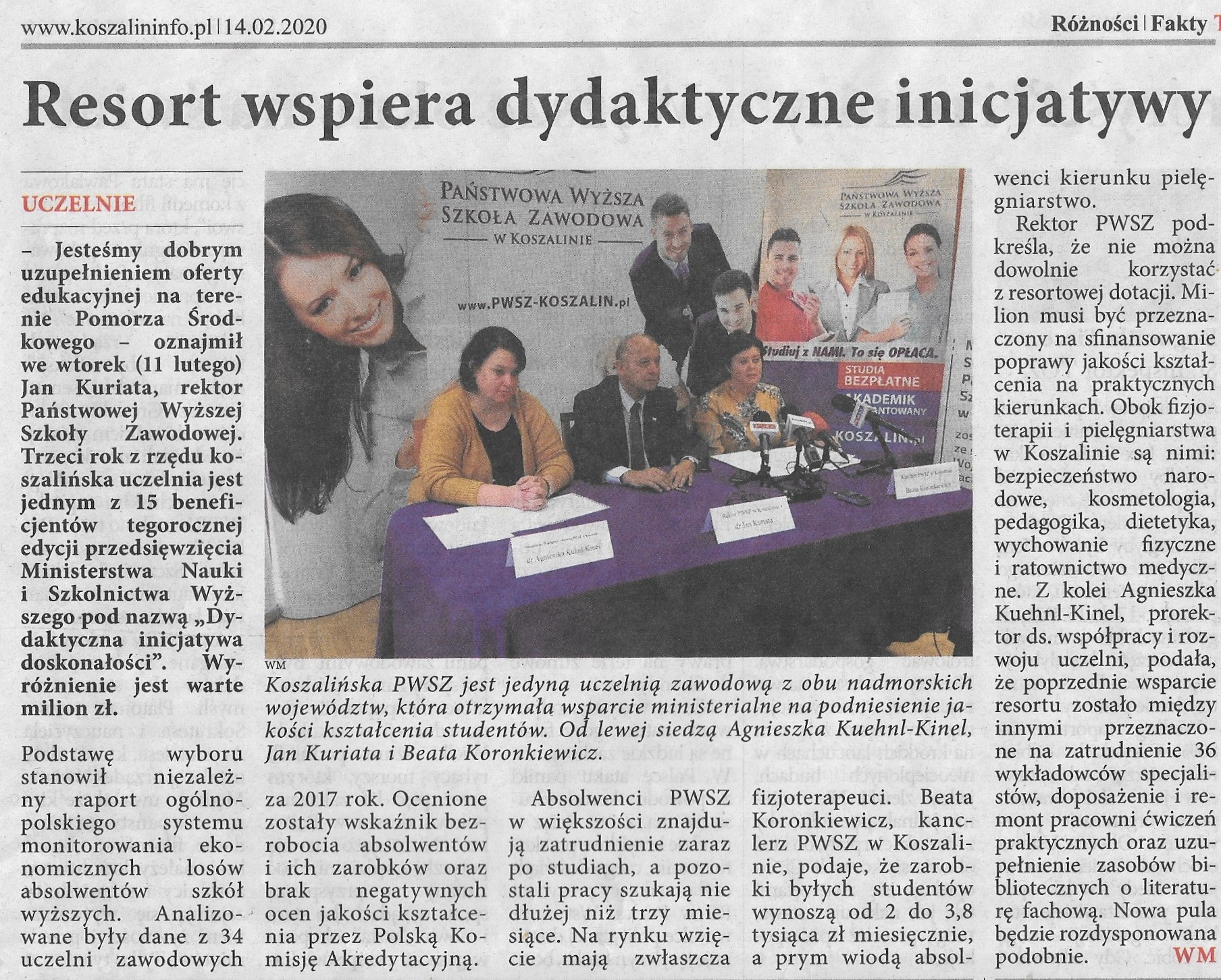 11.02.2020r. odbyła się konferencja prasowa z okazji otrzymania przez PWSZ w Koszalinie 1 miliona złotych z MNiSW. Uczelnia w ramach ministerialnego programu "Dydaktyczna Inicjatywa Doskonałości" otrzymała środki finansowe przeznaczone na podniesienie jakości kształcenia. Podstawę wyboru stanowiła analiza danych z raportów badania Ogólnopolskiego systemu monitorowania Ekonomicznych Losów Absolwentów szkół wyższych: wskaźnik bezrobocia i zarobków absolwentów PWSZ w Koszalinie oraz brak negatywnych ocen jakości kształcenia wydanych przez Polską Komisję Akredytacyjną w latach 2014-2019.