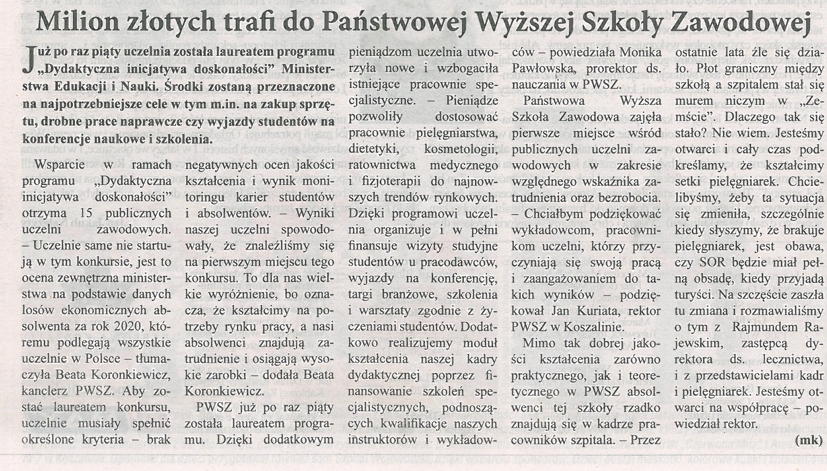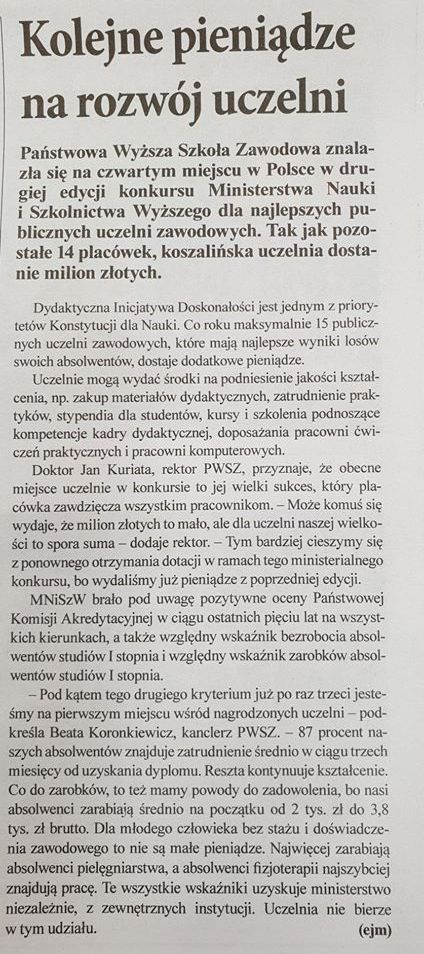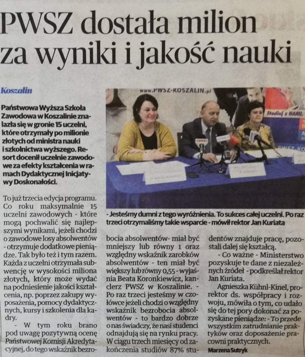 KoszalinInfo TV: "Jesteśmy dobrym uzupełnieniem oferty edukacyjnej na terenie Pomorza Środkowego – oznajmił we wtorek (11 lutego) Jan Kuriata, rektor PWSZ. Trzeci rok z rzędu koszalińska uczelnia jest jednym z 15 beneficjentów tegorocznej edycji przedsięwzięcia Ministerstwa Nauki i Szkolnictwa Wyższego pod nazwą „Dydaktyczna inicjatywa doskonałości”. Wyróżnienie jest warte milion złotych".