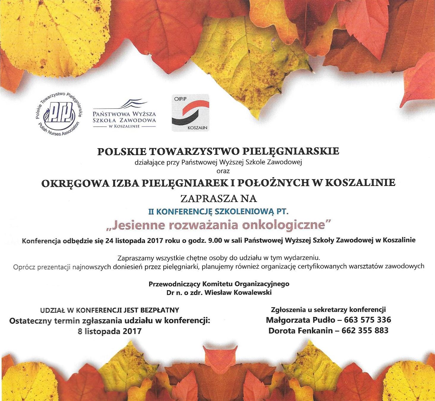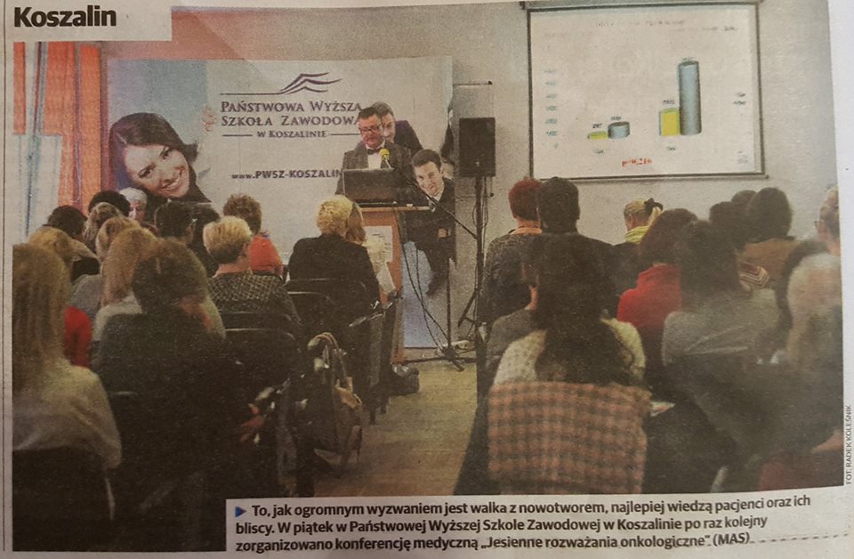 24.11.2017r. w PWSZ w Koszalinie odbyła się II konferencja medyczna „Jesienne rozważania onkologiczne”. Do udziału w konferencji zgłoszono referaty z tematyki dotyczącej problemów chorób nowotworowych. Wygłoszone referaty dotyczyły leczenia w ujęciu kompleksowym, problemów dotyczących jakości życia w tym, pielęgnowania ran pooperacyjnych oraz stomii. Podjęta została próba zainteresowania problemem duchowości i cierpienia w milczeniu oraz rola wsparcia poprzez aktywność fizyczną w chorobach nowotworowych. Omówiona została tematyka żywienia pacjentów. Do udziału w konferencji zaproszono firmy medyczne, które przedstawiły innowacyjne technologie leczenia ran oraz zastosowanie najnowszych rozwiązań z użyciem sprzętu stomijnego.