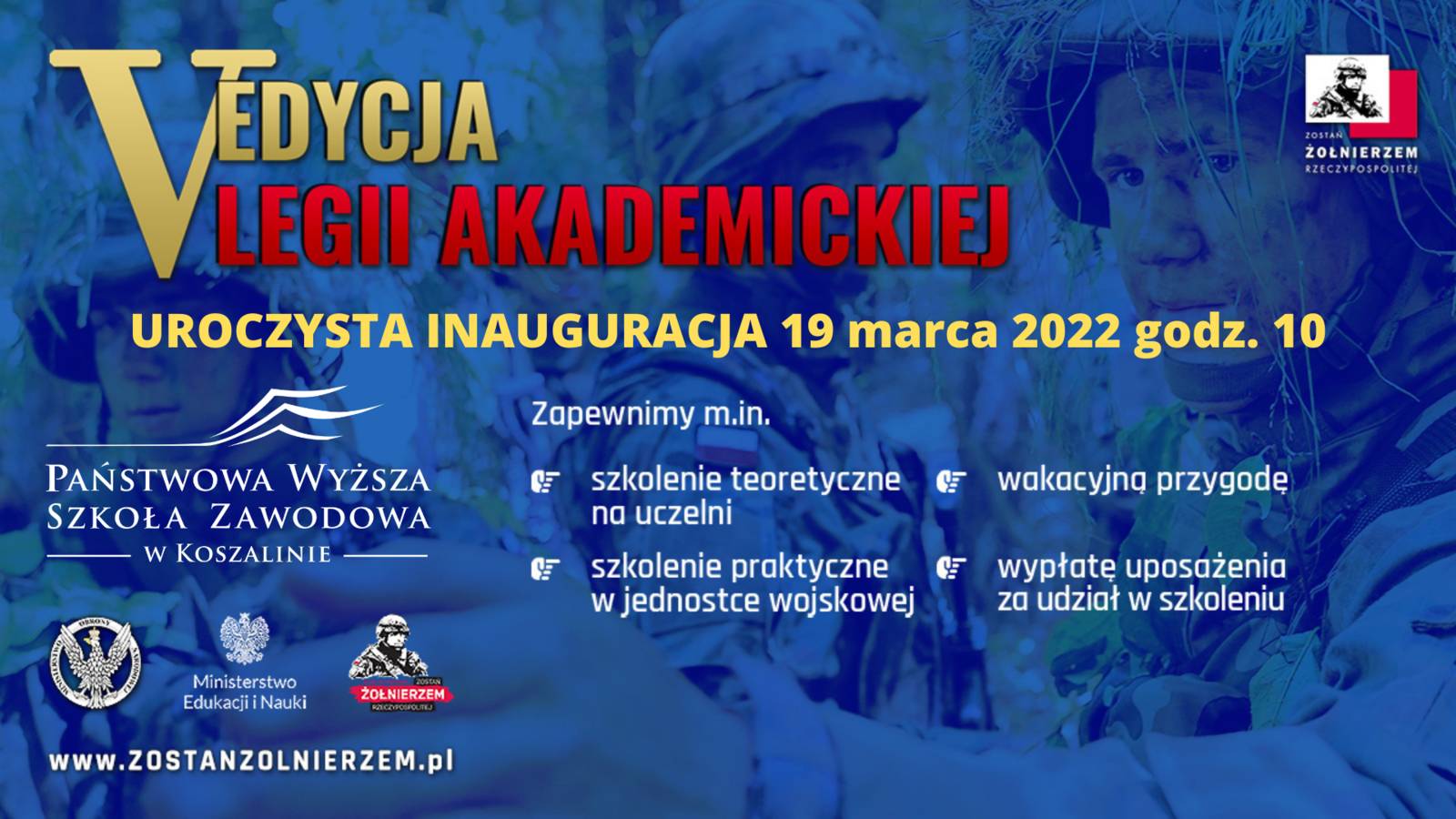 W dniu 19.03.2022 r. w Państwowej Wyższej Szkole Zawodowej w Koszalinie odbyła się uroczysta inauguracja V edycji programu ochotniczego szkolenia wojskowego studentów w ramach Legii Akademickiej. W trakcie uroczystości, w imieniu Pana Rektora dr. Jana Kuriaty, prof. PWSZ przybyłych gości oraz uczestników szkolenia powitała Prorektor ds. Współpracy i Rozwoju dr Magdalena Łuczkowska. Następnie uczestnikom programu zostały wręczone powołania potwierdzające rozpoczęcie szkolenia. W uroczystości wzięli udział m.in. przedstawiciele 8.Pułku Przeciwlotniczego, Żandarmerii Wojskowej, Wojskowej Komendy Uzupełnień i Orkiestry Wojskowej.