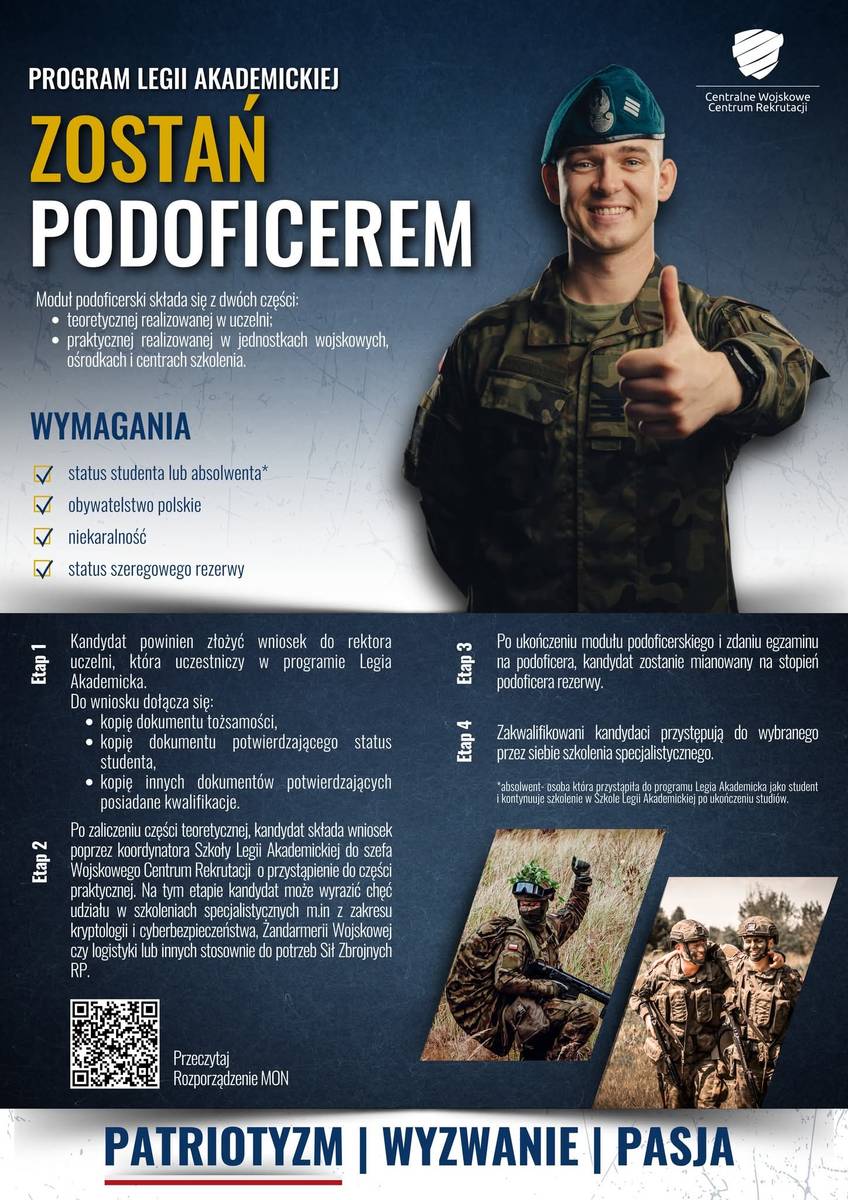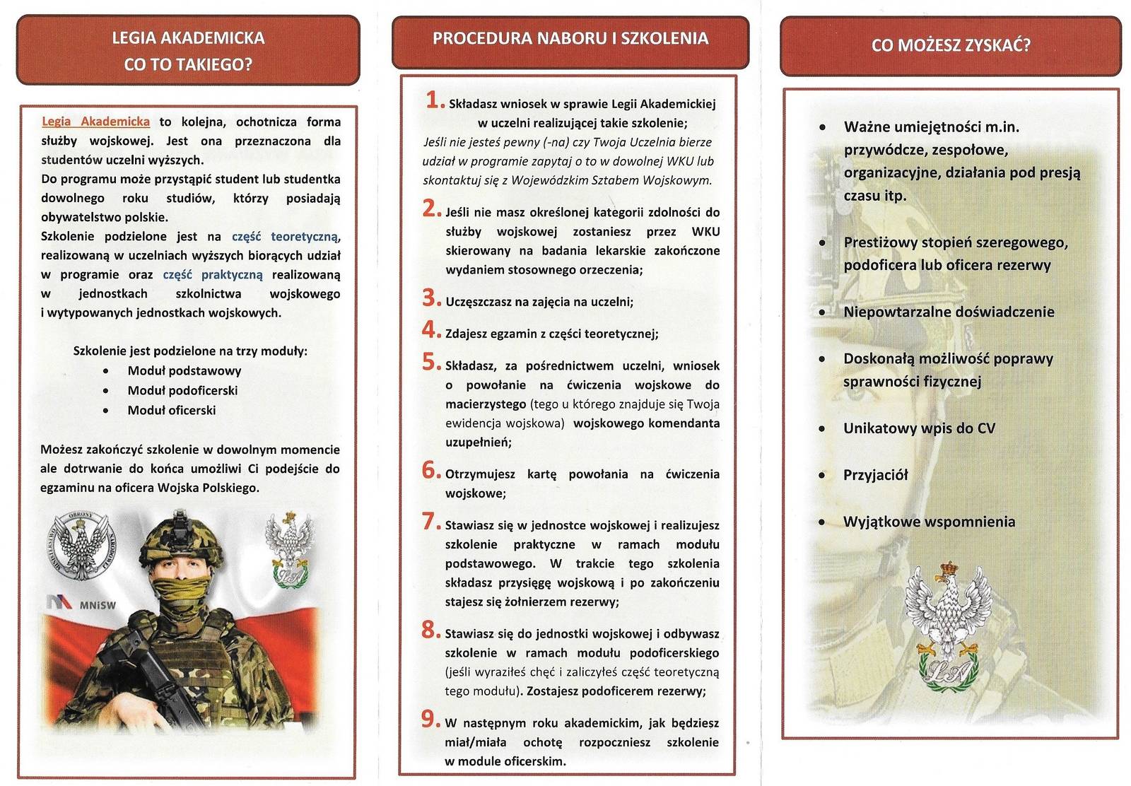 Zasadniczym założeniem projektu pn. „Legia Akademicka” jest przeprowadzenie przez uczelnię programu szkoleń (części teoretycznej) w obszarze modułu merytorycznego tj. modułu podoficerskiego w wymiarze 15 godzin. Ponadto część zajęć jest realizowana w formie elearningu. Tą część szkolenia studenci realizują we własnym zakresie po założeniu konta i otrzymaniu dostępu do platformy „Legia Akademicka”.