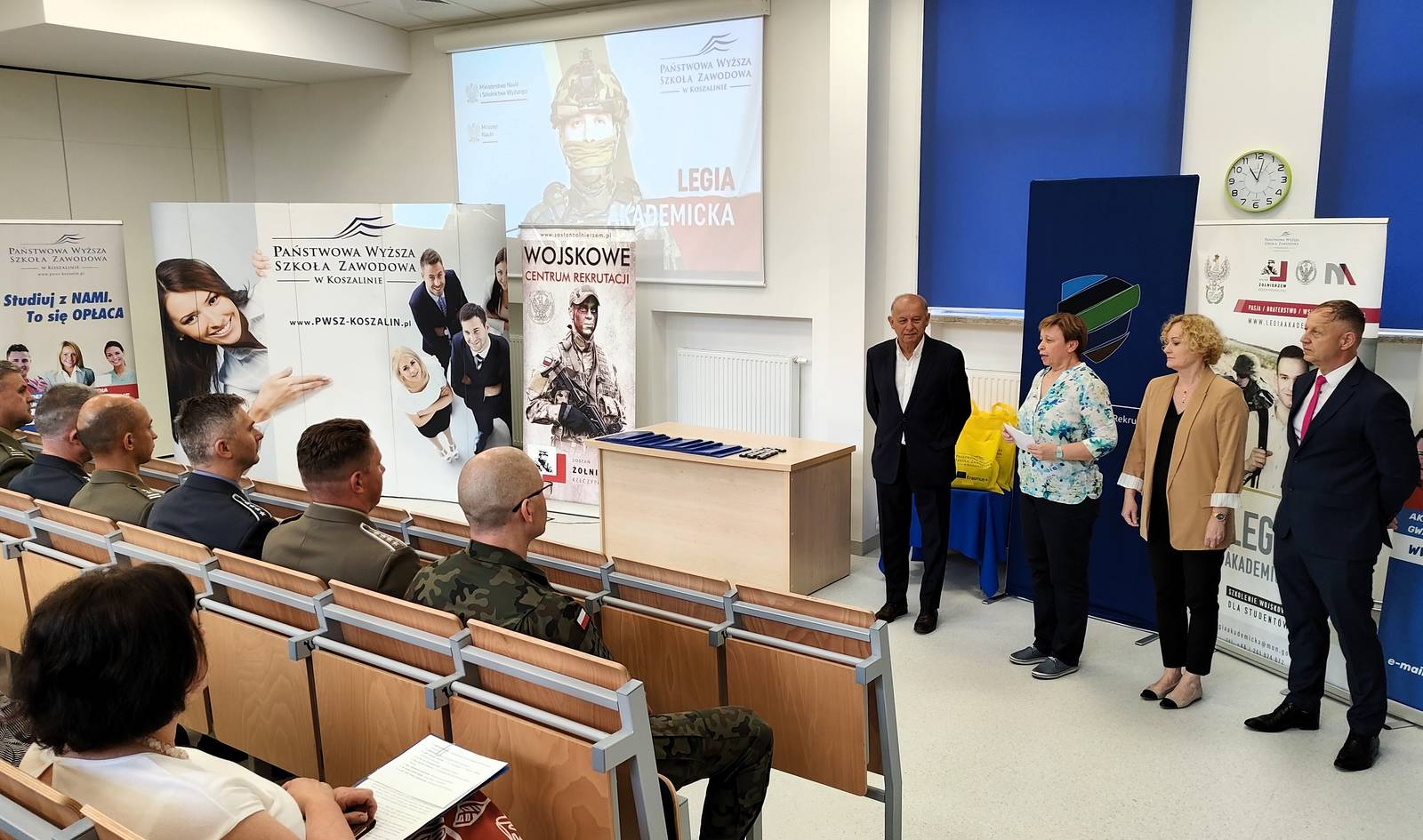 23.05.2024r. w PWSZ w Koszalinie odbyła się uroczystość zakończenia części teoretycznej ochotniczego szkolenia wojskowego studentów w ramach VII edycji Legii Akademickiej. Uczestnikom programu Rektor PWSZ dr Jan Kuriata, prof. PWSZ wręczył certyfikaty potwierdzające zakończenie modułu podoficerskiego. W uroczystości wzięli udział przedstawiciele m.in.: 8. Pułku Przeciwlotniczego, Centrum Szkolenia Sił Powietrznych w Koszalinie, Żandarmerii Wojskowej, Wojskowego Centrum Rekrutacji, 17. Wojskowego Oddziału Gospodarczego w Koszalinie, Aresztu Śledczego w Koszalinie,