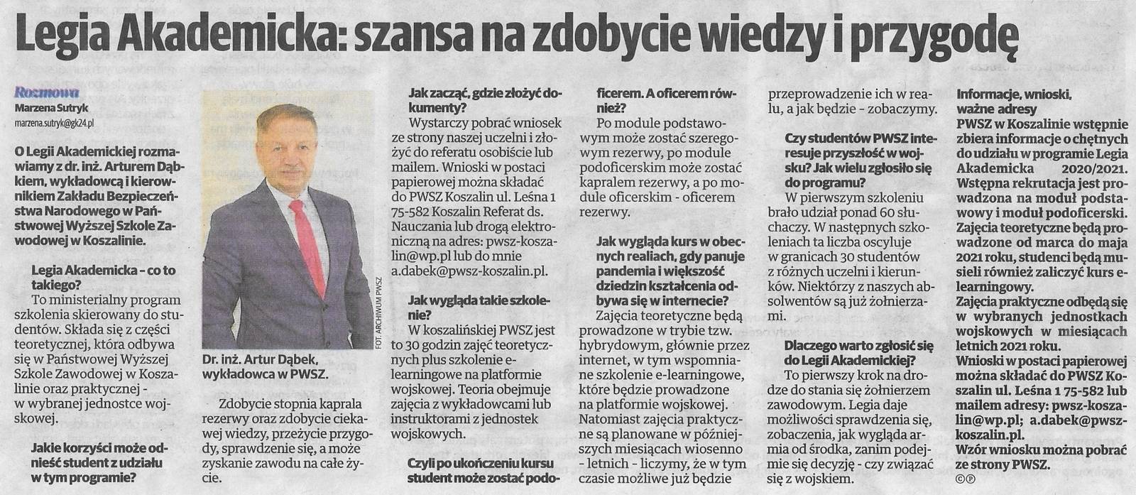 Wywiad z Pełnomocnikiem ds. Legii Akademickiej dr Arturem Dąbkiem - Głos Koszaliński - 5.02.2021