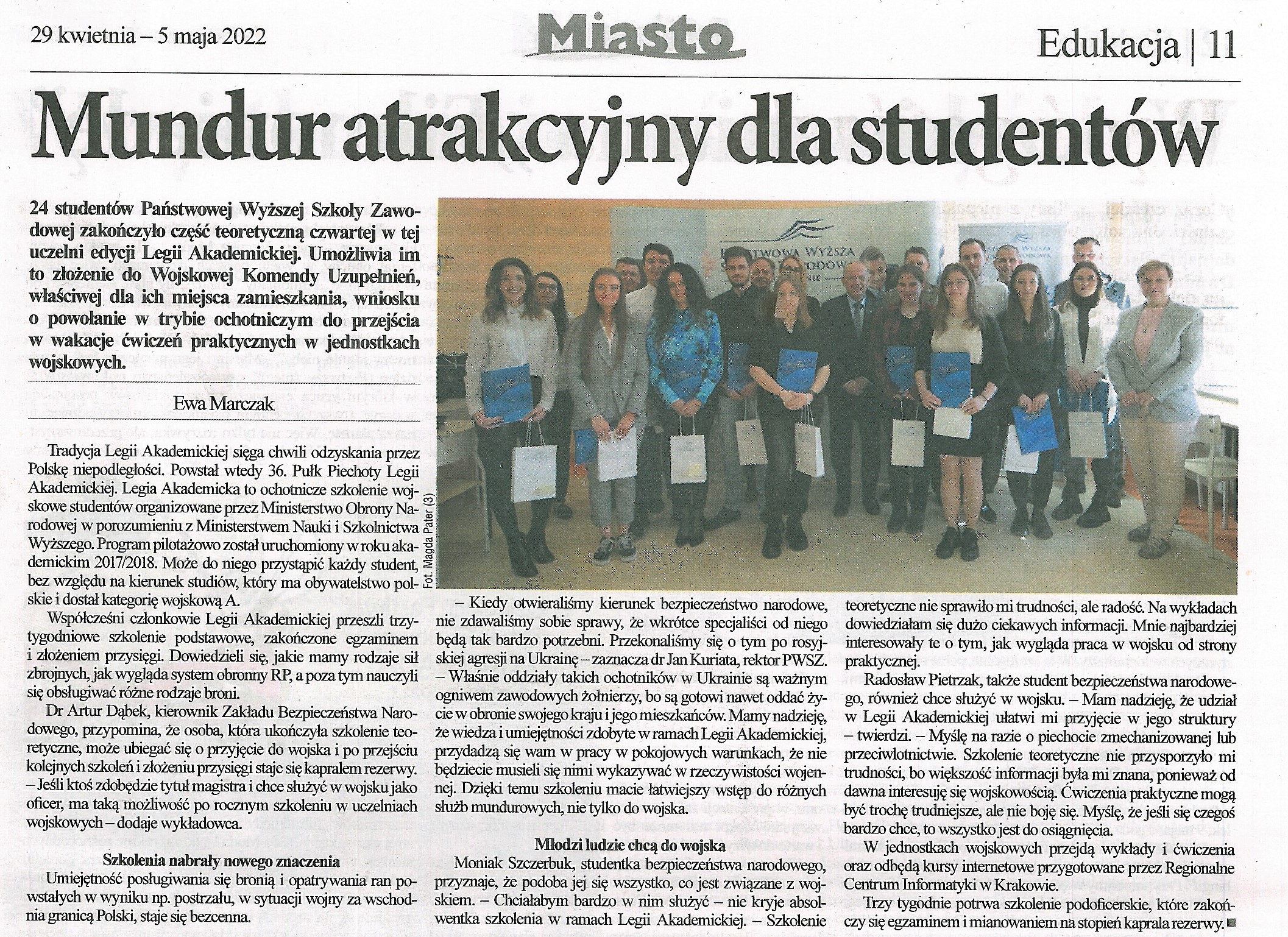 14.05.2019r. odbyła się uroczystość zakończenia pierwszej edycji Programu Legia Akademicka. „Legia Akademicka” to uruchomiony w 2017 roku przez Ministerstwo Obrony Narodowej program ochotniczego szkolenia studentów. W trakcie uroczystości zostały wręczone certyfikaty potwierdzające ukończenie szkolenia. W wakacje odbędzie się część praktyczna programu w wytypowanych jednostkach wojskowych. Po pozytywnie zaliczonym szkoleniu student zostaje mianowany na stopień kaprala rezerwy.