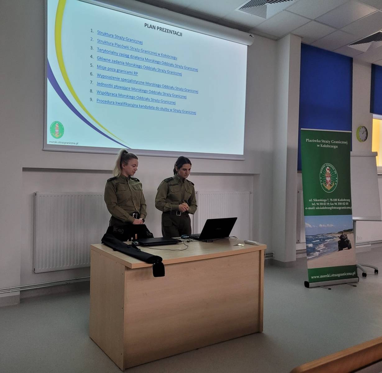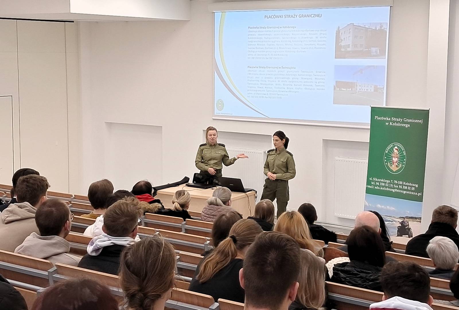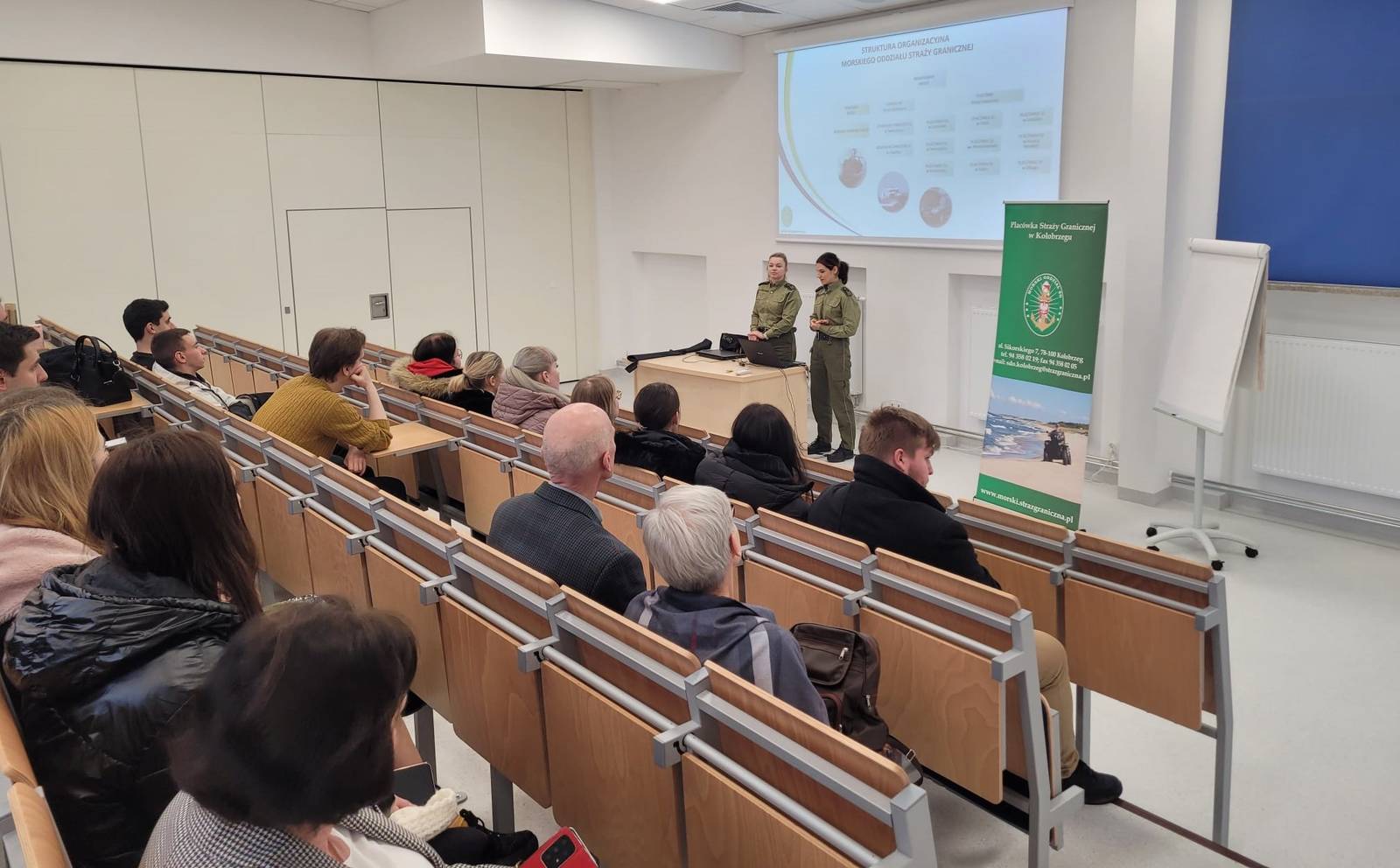 25. stycznia 2024r. przedstawicielki Morski Oddział Straży Granicznej Placówka Straży Granicznej w Kołobrzegu Pani st. Sierż. SG Amanda Tatara i Pani Sierż. SG Daria Walkowiak zaprezentowały studentom PWSZ w Koszalinie kierunku #WychowanieFizyczne i #BezpieczeństwoNarodowe strukturę organizacyjną i główne zadania jednostki SG.