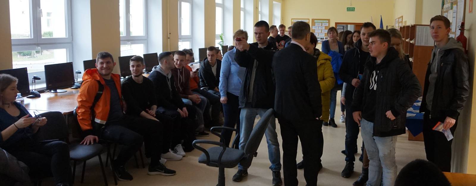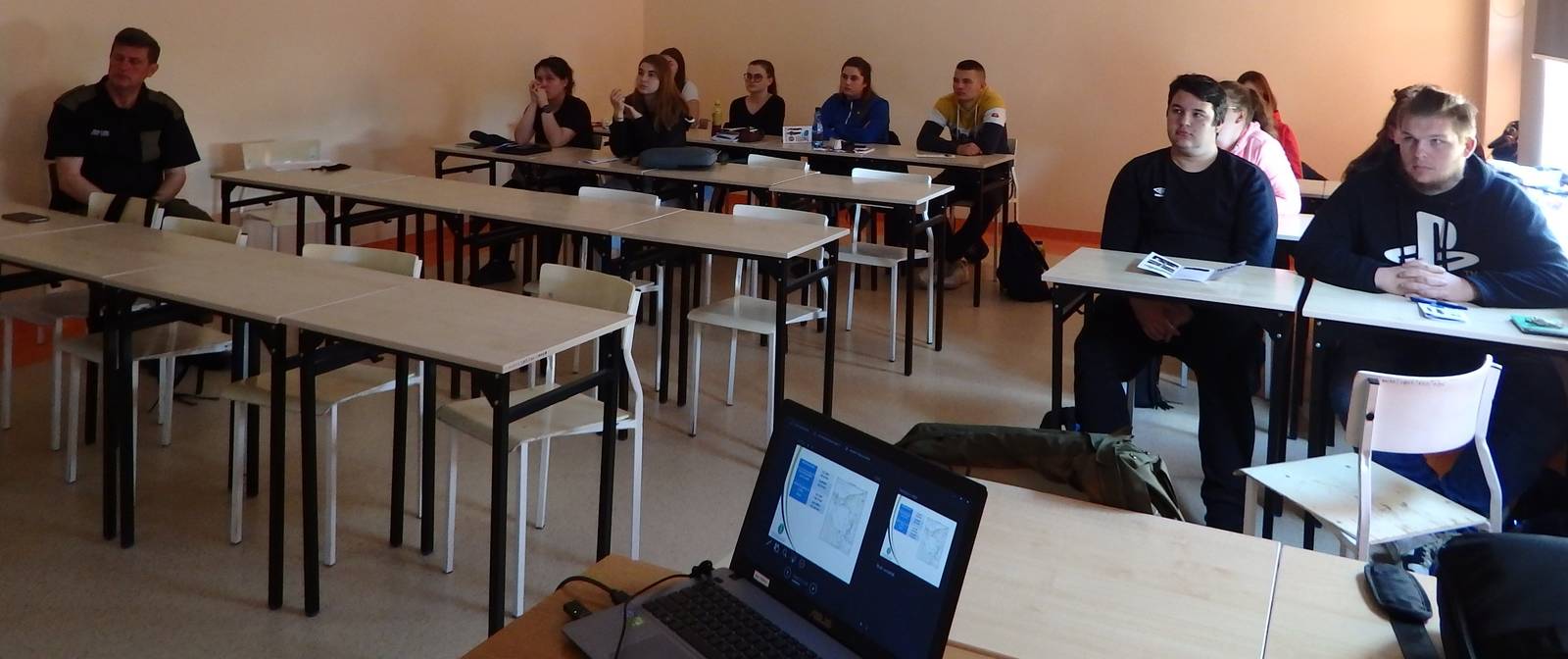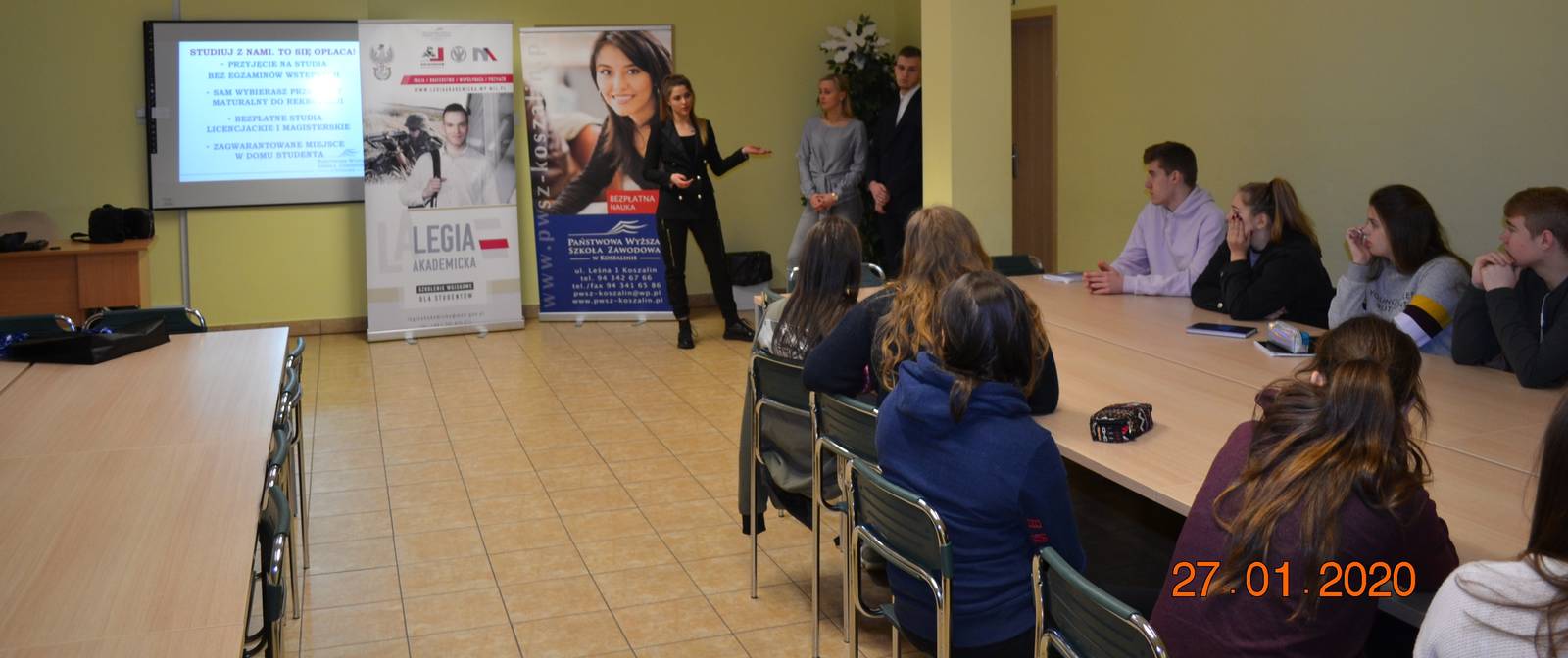 Studenci I i II roku kierunku Bezpieczeństwo Narodowe prezentowali ofertę edukacyjną w murach VI Liceum Ogólnokształcącego w Koszalinie. W trakcie spotkania uczniowie liceum wraz z Panią Mariolą Włodarczyk zadawali pytania związane z realizacją kształcenia na naszej uczelni. Szczególne zainteresowanie wzbudziły zajęcia o charakterze praktycznym oraz brak przedmiotów ścisłych w programie kształcenia. Studenci wskazali również na możliwości rozwijania zainteresowań w ramach kół naukowych czy kursów.