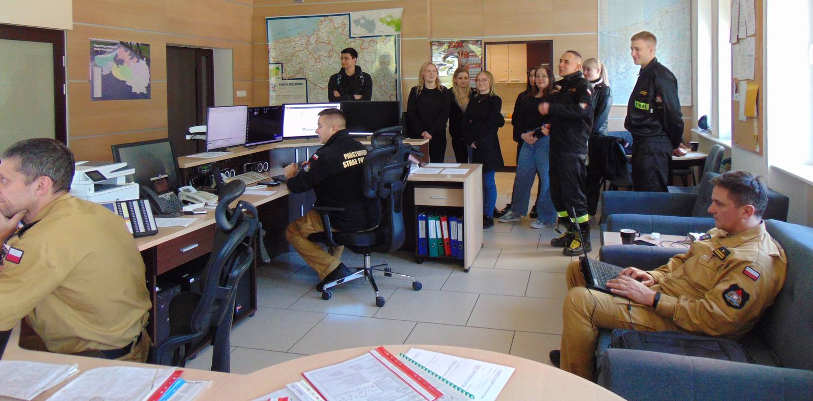 18.04.2024 r. studenci II roku kierunku Bezpieczeństwo Narodowe, wraz z wykładowcą dr. inż. Waldemarem Parusem, gościli w Komendzie Miejskiej Państwowej Straży Pożarnej w Koszalinie, gdzie mieli możliwość zapoznania się ze strukturą organizacyjną i zadaniami Stanowiska Kierowania PSP i funkcjonowaniem JRG II oraz Stanowiska Kierowania Zarządzania Kryzysowego Miasta Koszalina. Wizyta studyjna pozwoliła na praktyczne zapoznanie studentów z funkcjonowaniem Straży Pożarnej w systemie bezpieczeństwa i zarządzania kryzysowego w aglomeracji miejskiej, realizacją zadań dot. bezpieczeństwa ppoż., zasadami współpracy z instytucjami współdziałającymi, a także specyfiką realizacji zadań związanych z organizacją i prowadzeniem centrum powiadamiania ratunkowego. Współpraca z takimi instytucjami jak Państwowa Straż Pożarna ma duże znaczenie dla zapewnienia wysokiego poziomu kształcenia praktycznego studentów PWSZ w Koszalinie.
