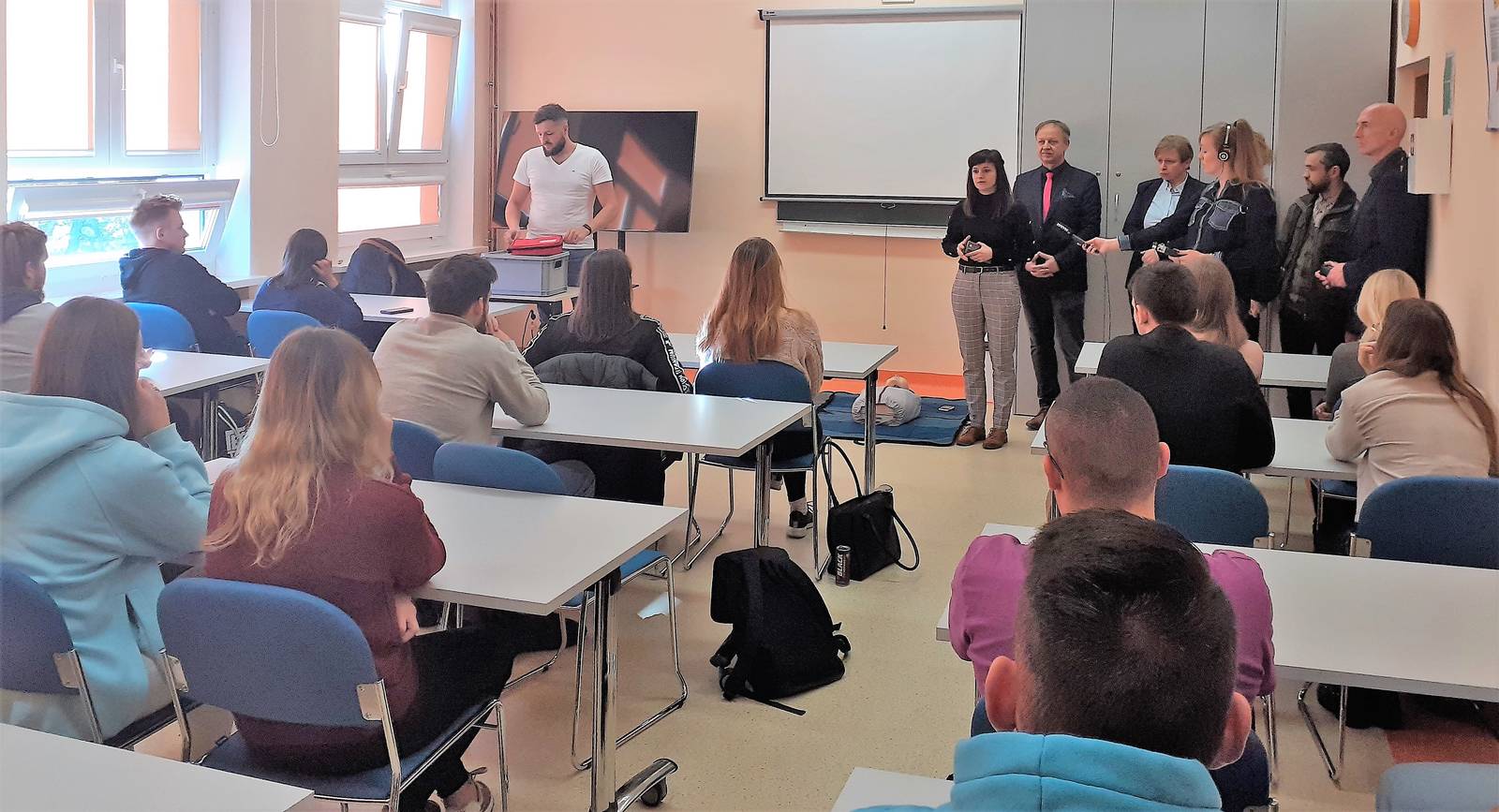 Studenci kierunku Bezpieczeństwo narodowe wzięli udział w szkoleniu z zakresu udzielania pierwszej pomocy przedmedycznej oraz obsługi i użycia defibrylatora AED - medycznego urządzenia do przeprowadzania reanimacji. Szkolenie zrealizowane w ramach budżetu obywatelskiego pn. „40 Punktów Życia – defibrylatory AED w miejscach publicznych – bezpieczny Koszalin” edycja 2021, miało na celu poprawę bezpieczeństwa i świadomości studentów w dziedzinie udzielania pierwszej pomocy przy użyciu urządzenia oraz wzbogaciło ich umiejętności praktyczne. Szkolenie przeprowadziła firma AEDMAX.PL Sp. z o.o. z Warszawy, a udział został potwierdzony certyfikatem. W szkoleniu udział weźmie Przedstawiciel Wydziału Kultury i Spraw Społecznych UM Koszalin Pani Sylwia Langner-Głuszek.