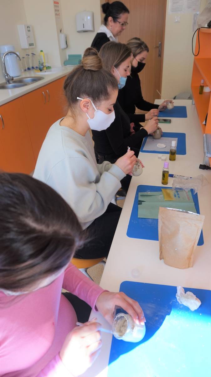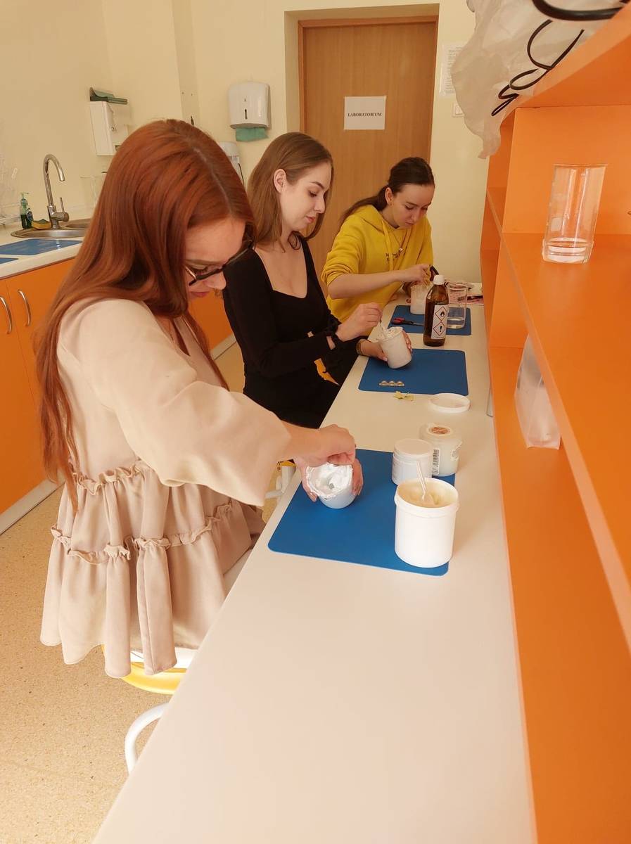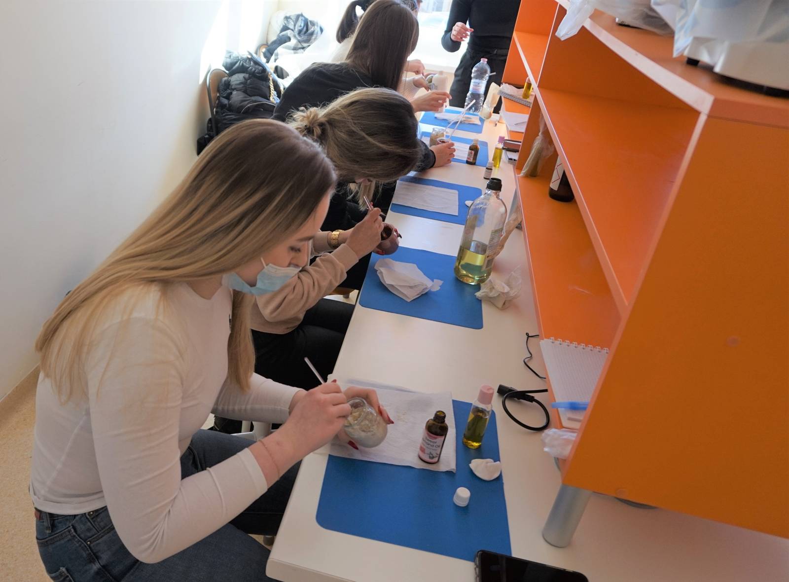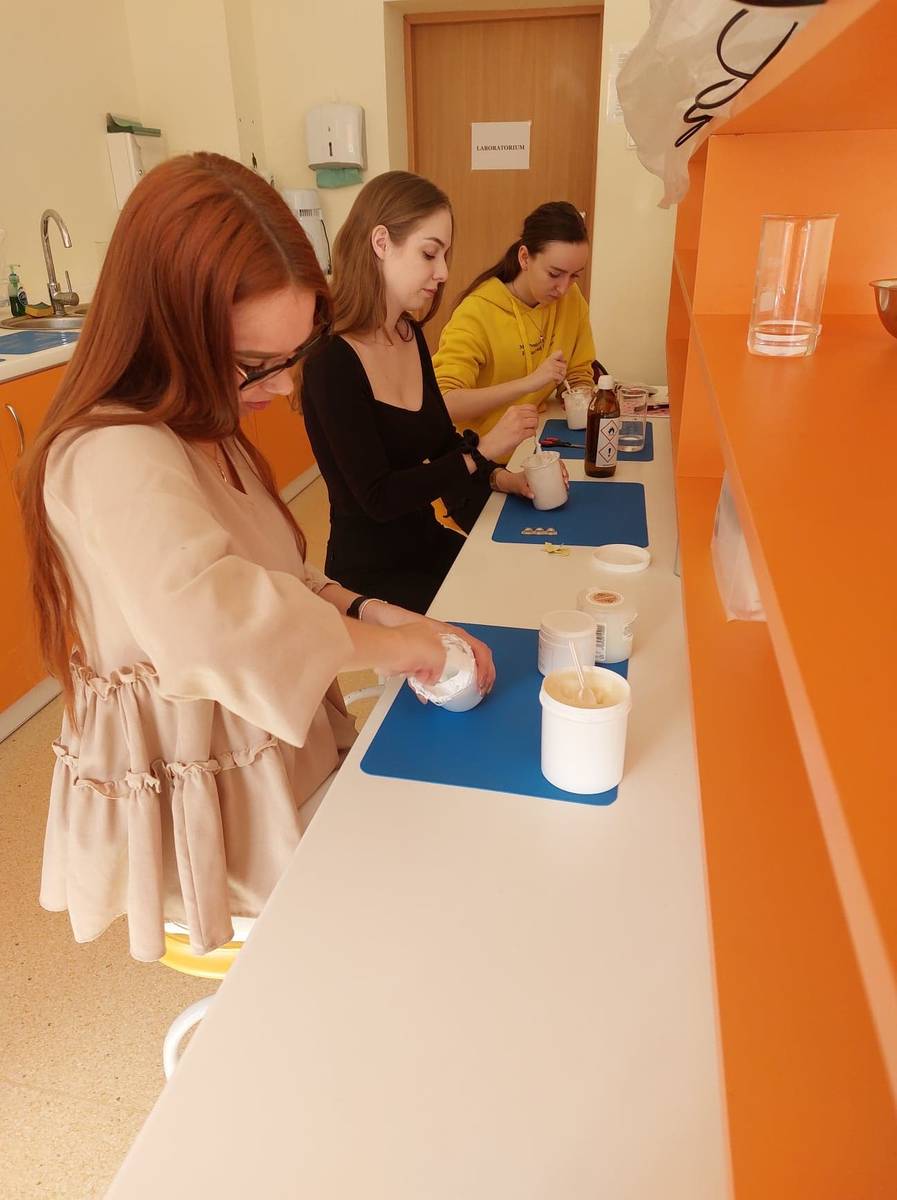 W ramach zajęć praktycznych "Aromoterapia" z mgr Danutą Dudziec-Liśniewską studentki 1 roku wykonują musujące "kwiatki" do kąpieli ze skórką pomarańczową.