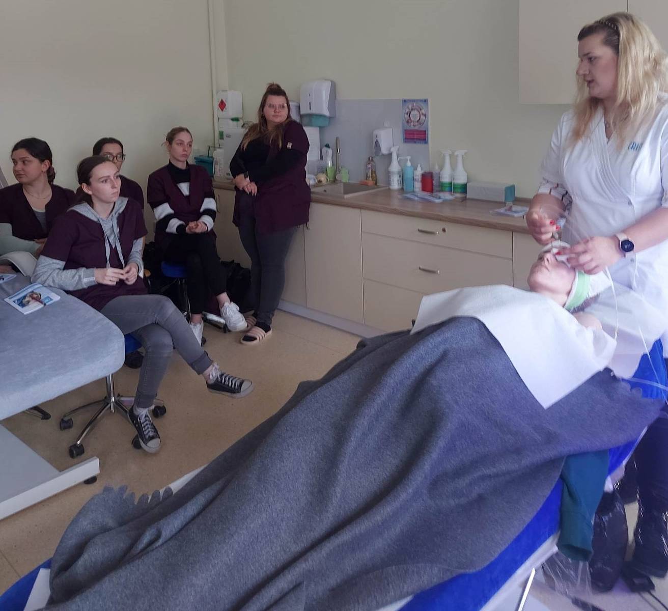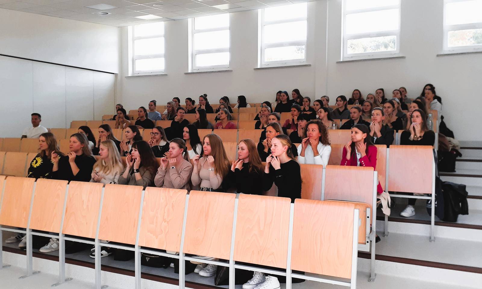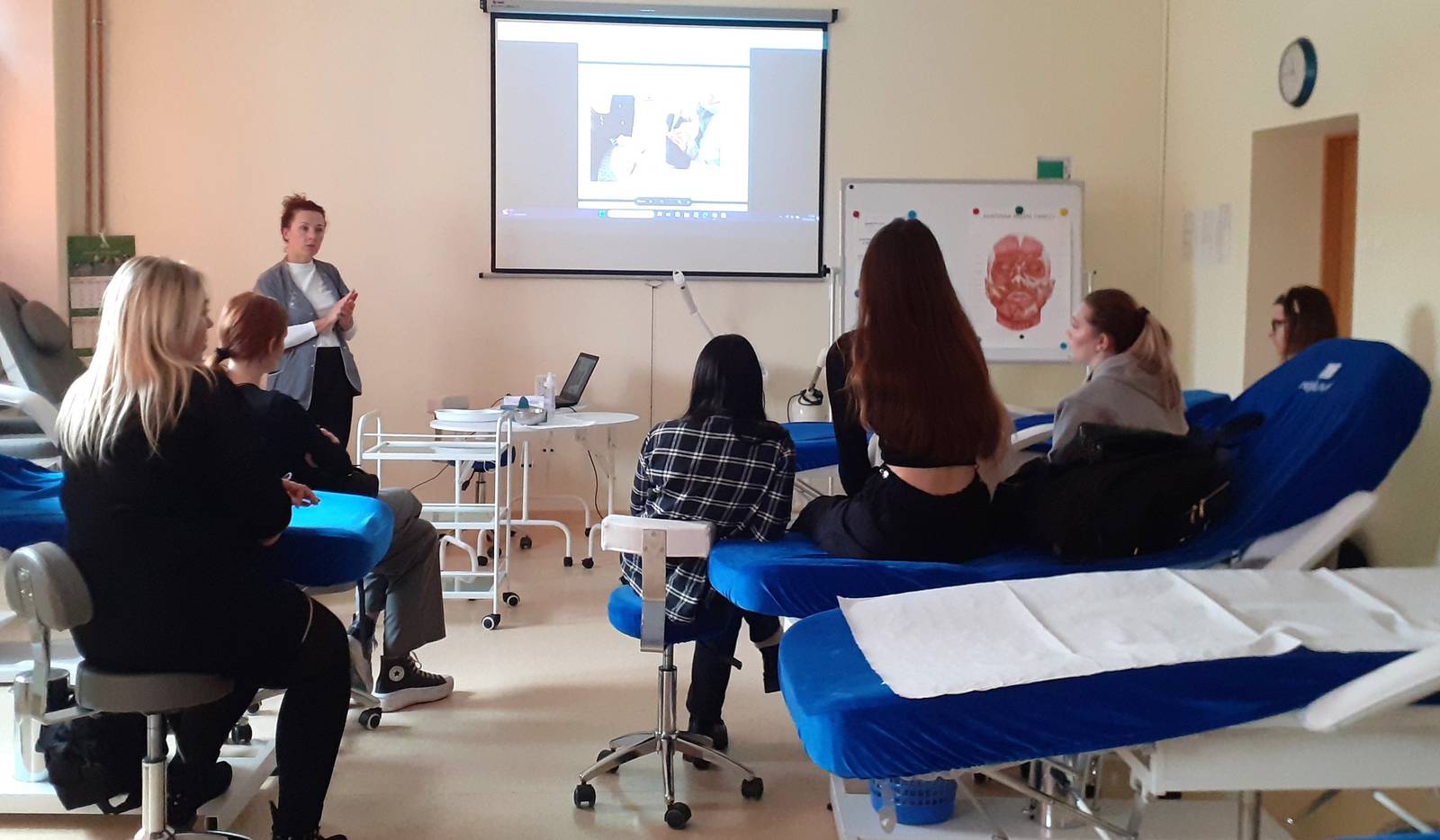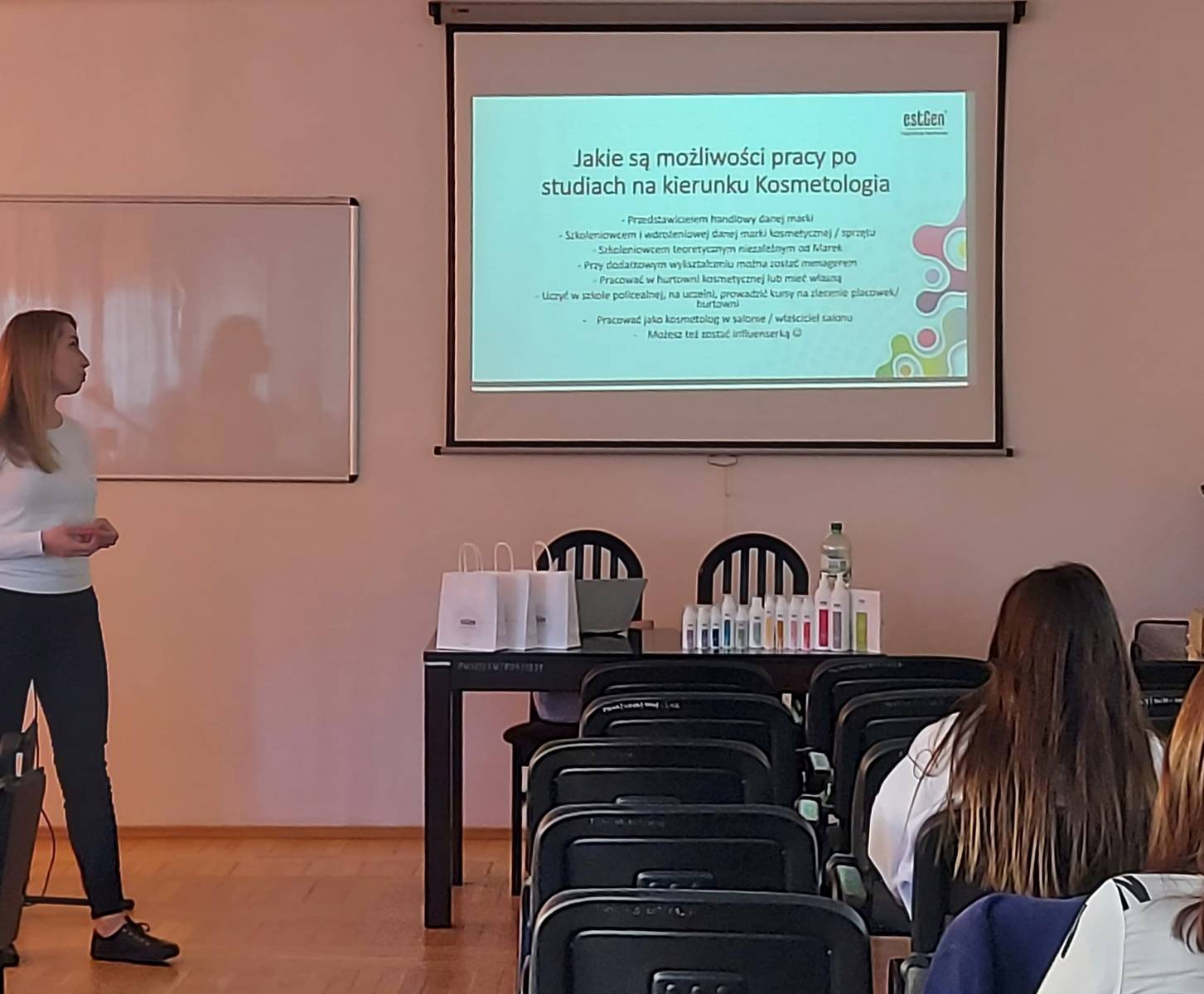 12.04.2022r. studentki kosmetologii wysłuchały wykładu pt.„Możliwości pracy i rozwoju w zawodzie kosmetologa” we współpracy z marką Estgen, specjalisty i szkoleniowca mgr Moniki Turowskiej, kosmetolog, wieloletni praktyk, specjalista w bioinżynierii tkankowej i biorewitalizacji skóry.