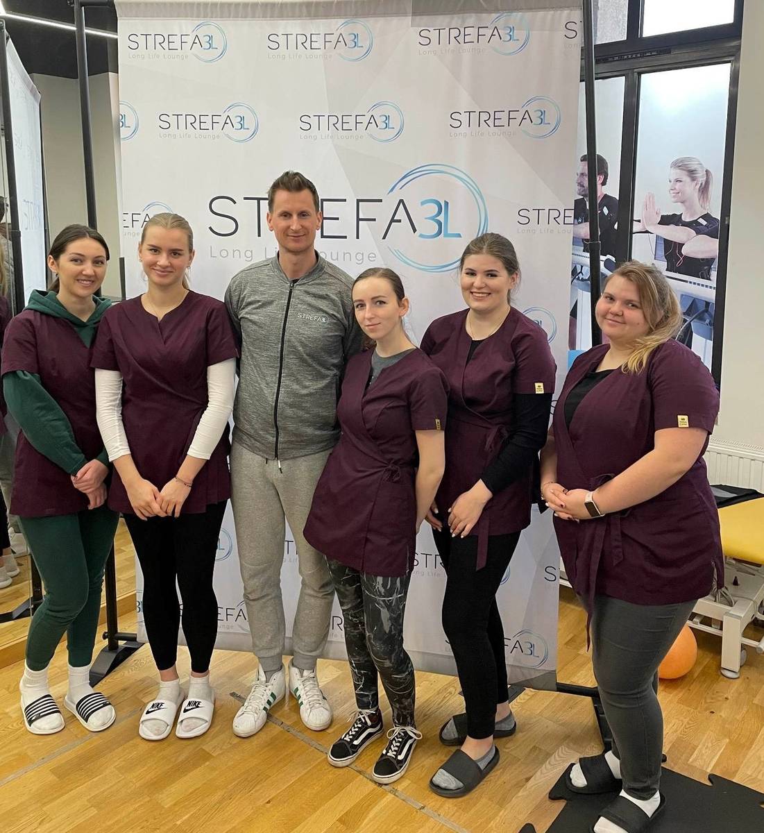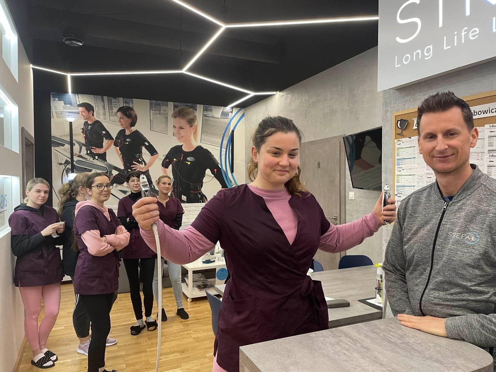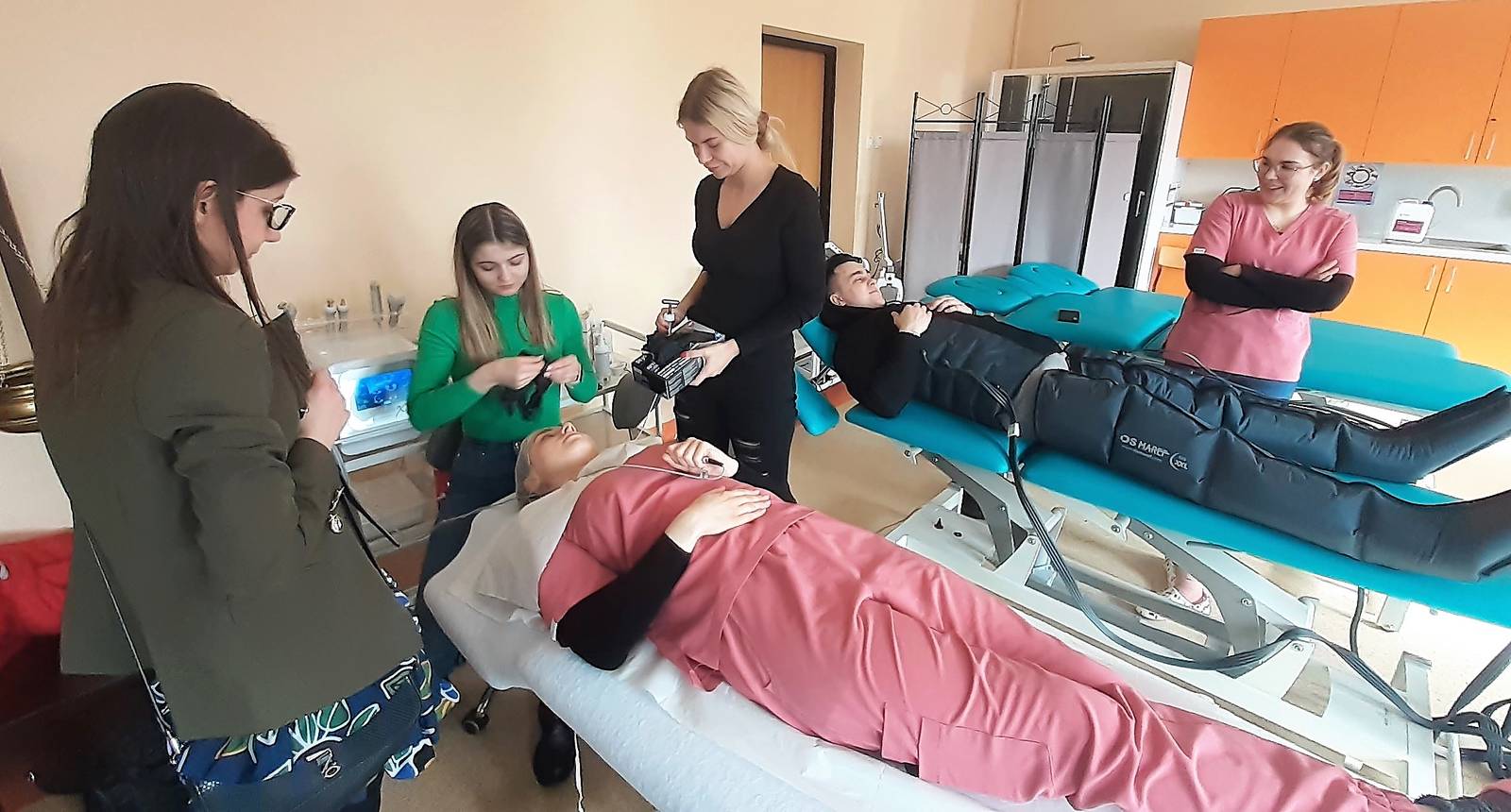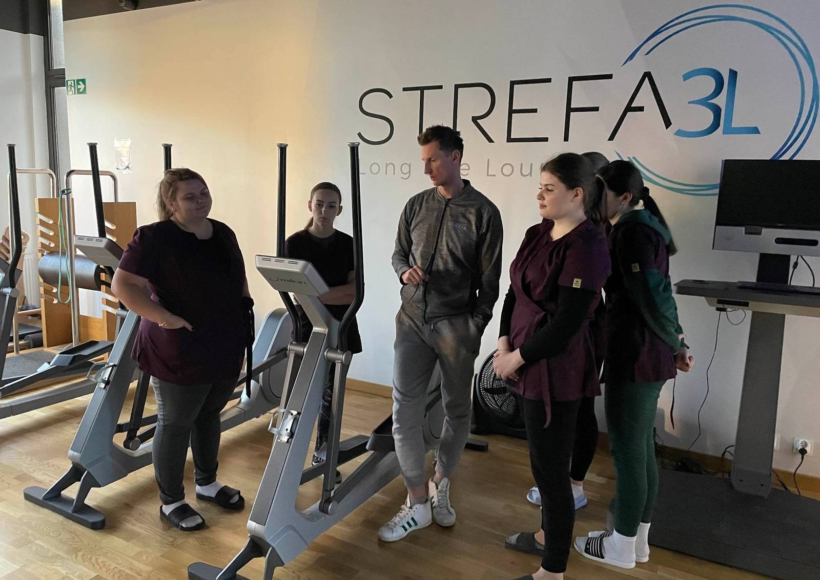 W dniu 28.11.2022r. studentki 3 roku kosmetologii w ramach zajęć praktycznych „Kosmetologia w Wellness i SPA” z mgr Lidia Sarapuk-Łycuś odwiedziły Strefa 3L w Koszalinie. Podczas wizyty studentki obserwowały oraz czynnie uczestniczyły w pokazie nowoczesnego treningu EMS oraz treningu obwodowego z wykorzystaniem nowoczesnej aparatury, która wspomagają terapie antycellulitowe i redukujące tkankę tłuszczową oraz wpływa wzmacniająco na pracę mięśni. Podczas wizyty trener personalny p. Marcin Marczak wykonał i omówił pomiar masy ciała każdej ze studentek. Wizyta odbyła się dzięki środkom pozyskanym z programu Ministerstwa Edukacji i Nauki pn. "Dydaktyczna Inicjatywa Doskonałości".