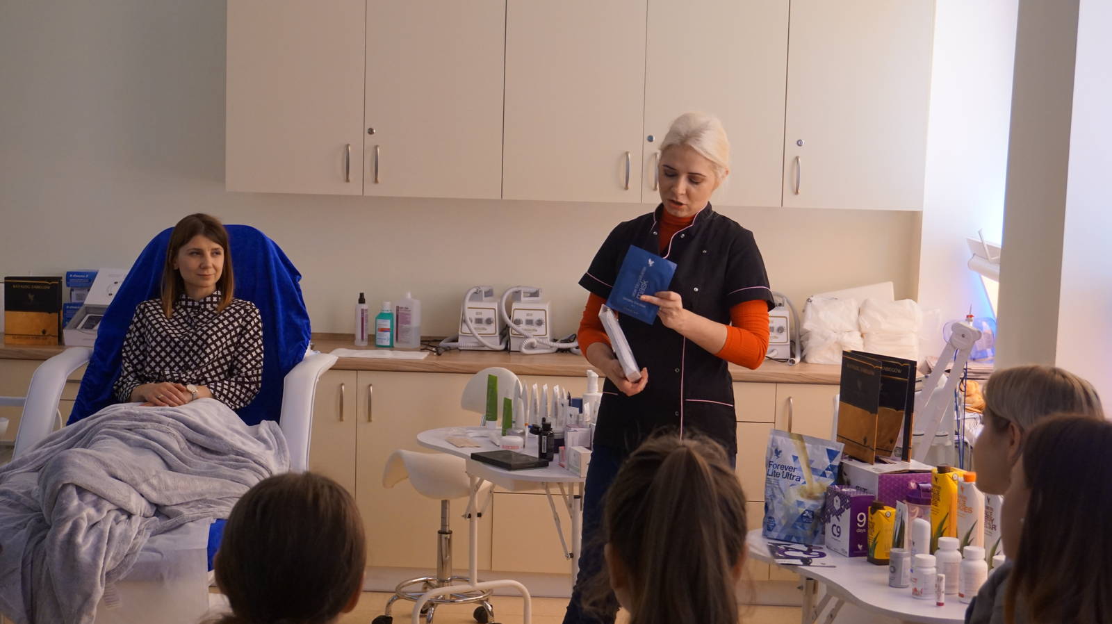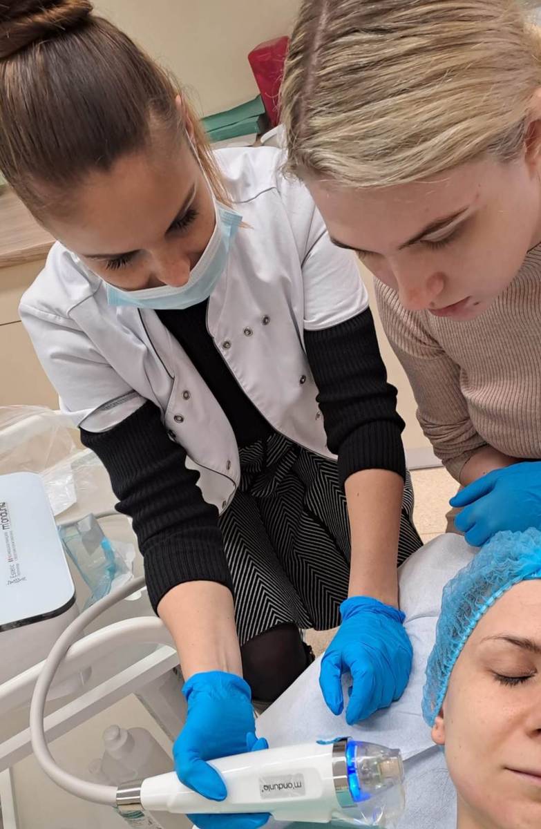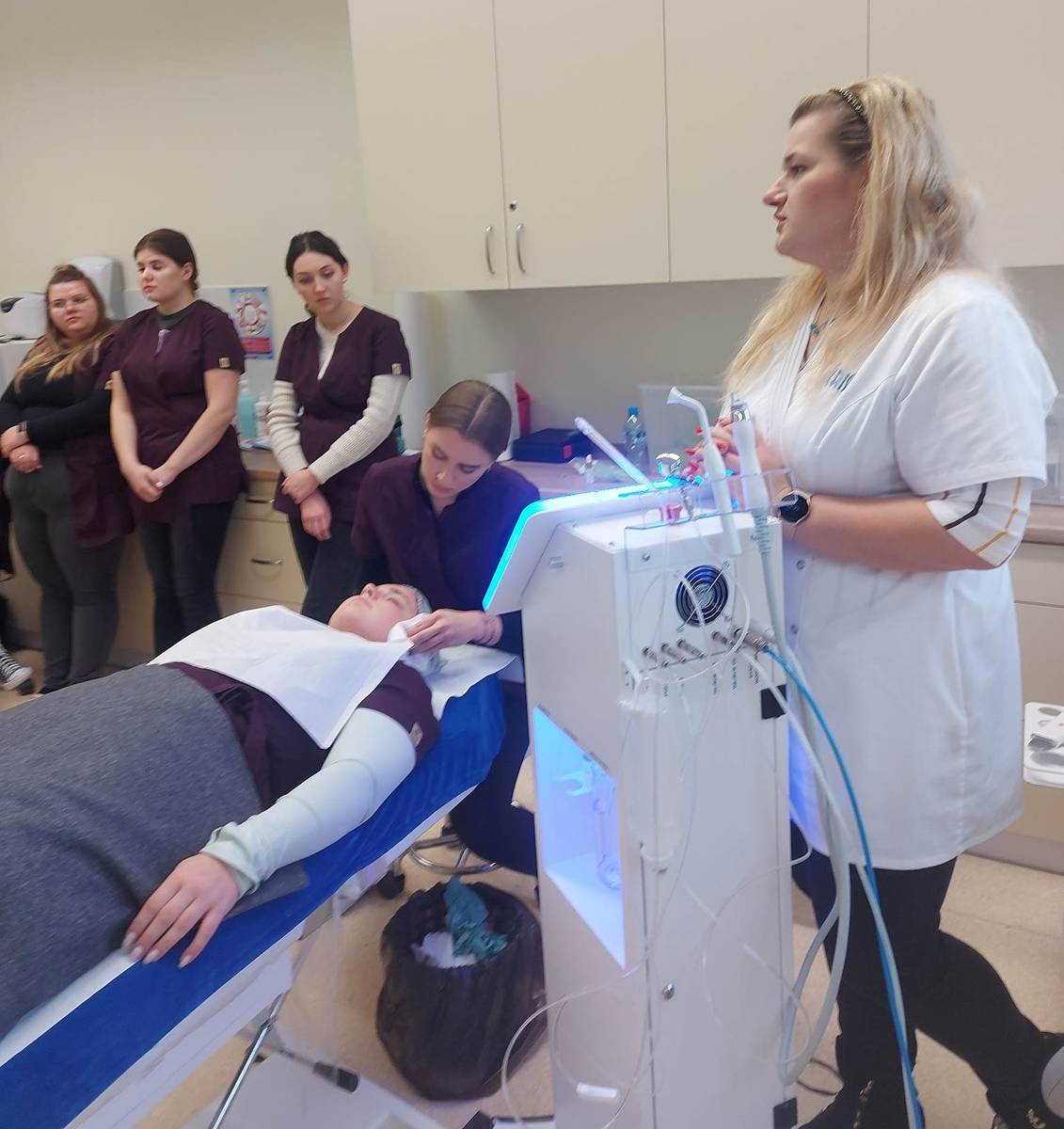 Zajęcia studentek 3 roku w ramach zajęć praktycznych z "Kompleksowej kosmetyki twarzy" rozpoczęły się od warsztatów z nowoczesnych urządzeń stosowanych w kosmetologii. W trakcie warsztatów Pani Aleksandra Rzepka z firmy M’onduniq Cosmetiques Professionnel zaprezentowała studentkom prace na urządzeniach: HIFU i radiofrekwencji mikroiglowej.
