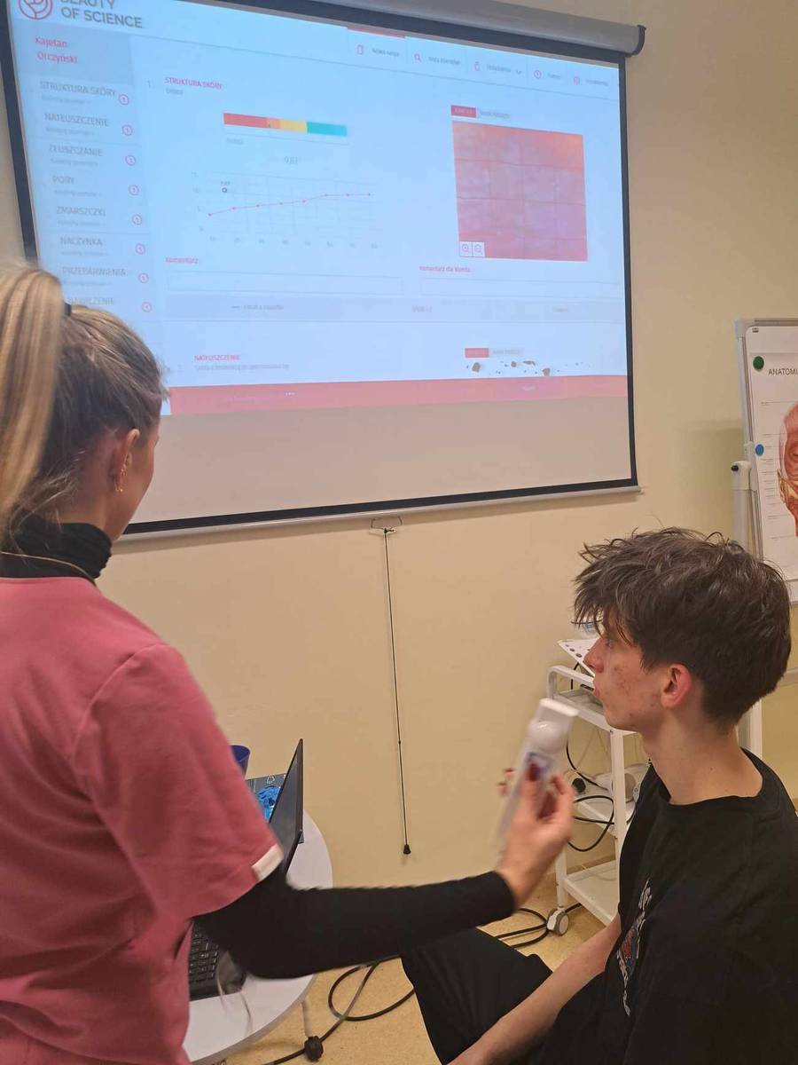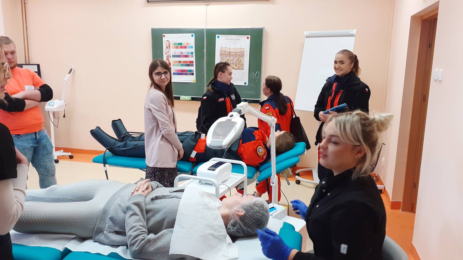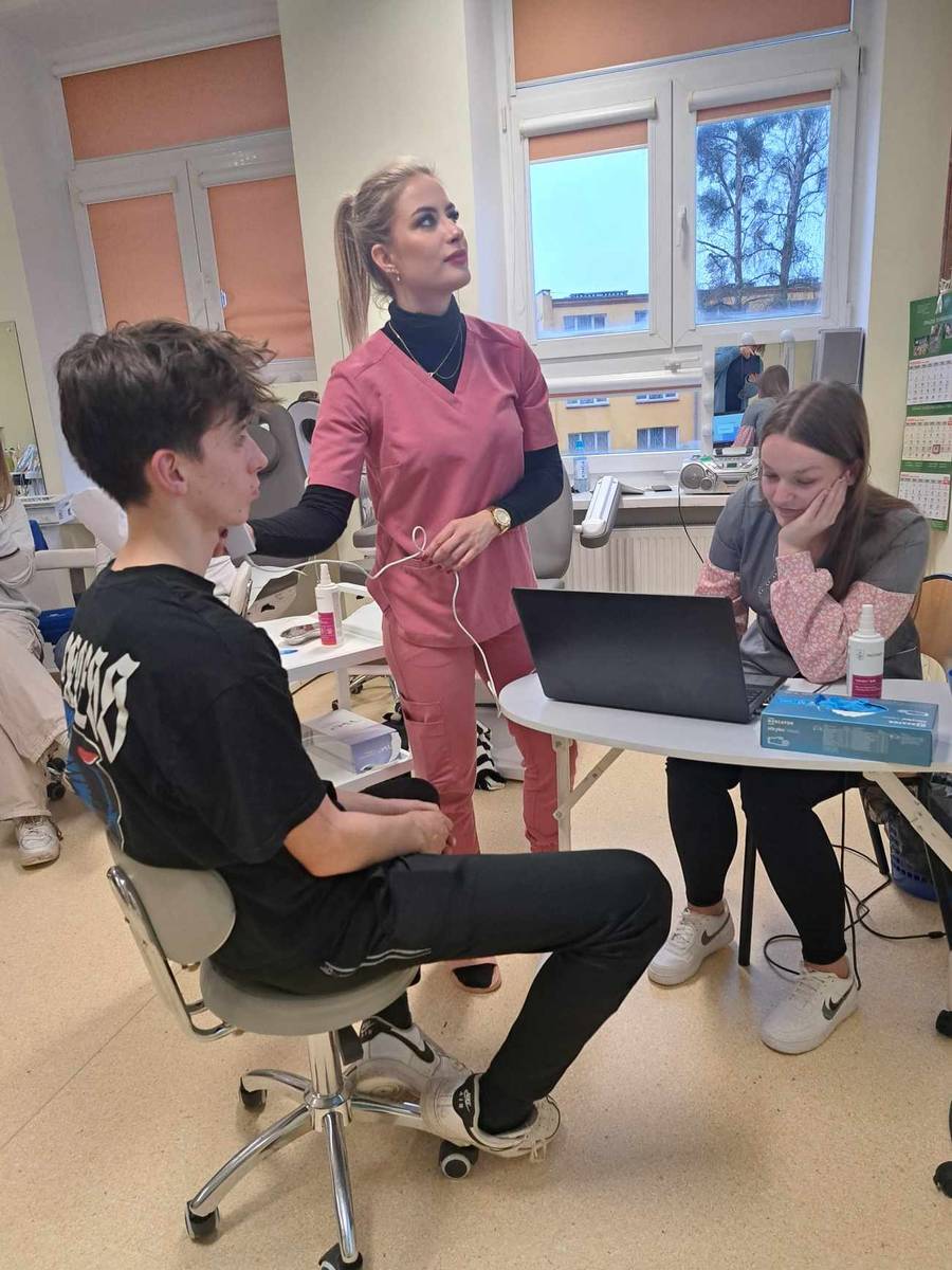 Uczniowie brali udział w pokazie zabiegu oxybrazji i peelingu grawitacyjnego.