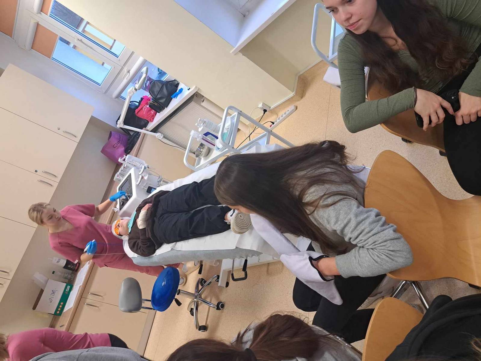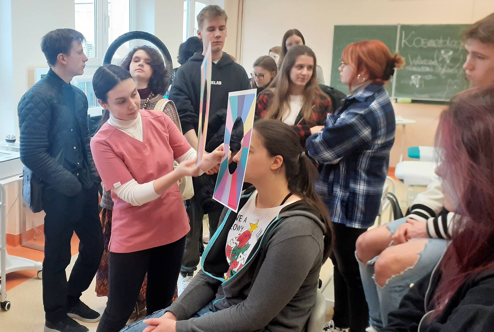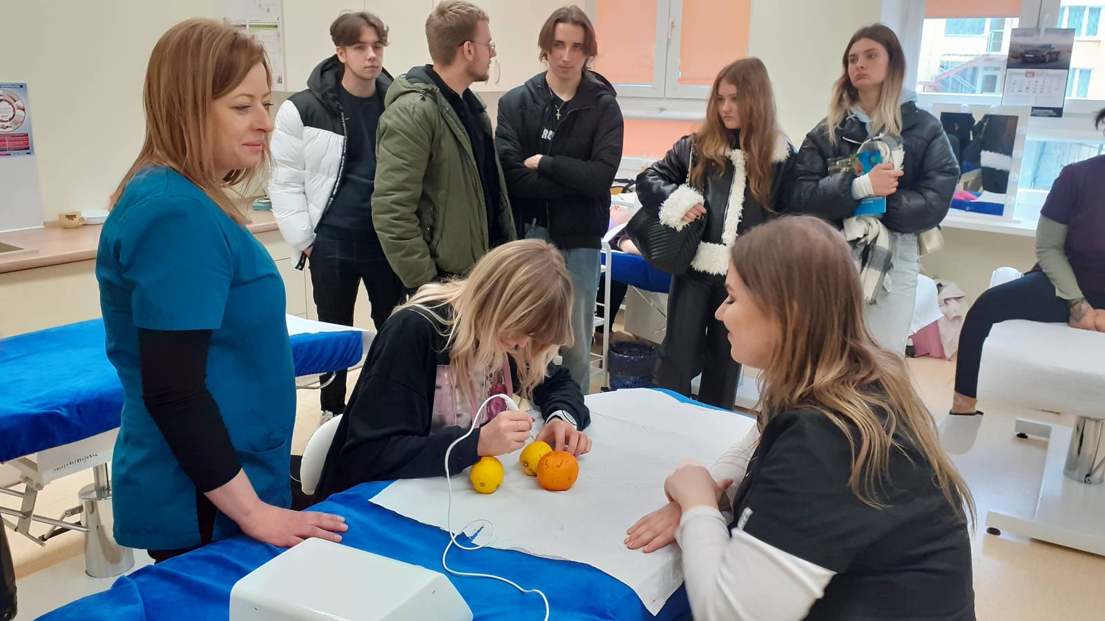 Uczniowie brali udział w pokazie zabiegu oxybrazji i peelingu grawitacyjnego.
