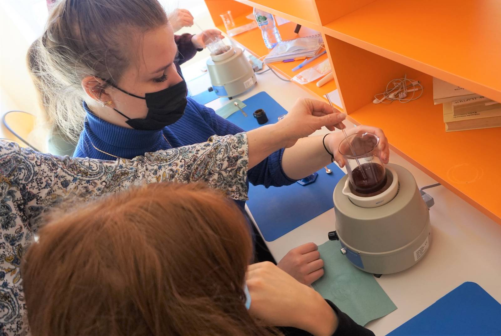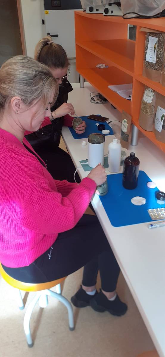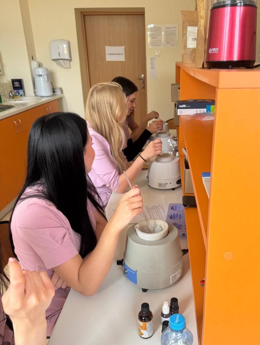Zajęcia praktyczne studentek 2 roku Kosmetologii w ramach przedmiotu "Receptura kosmetyczna" z mgr Danutą Dudziec-Liśniewską to praktyczna umiejętność wykonywania leczniczych preparatów z ziół i roślin.