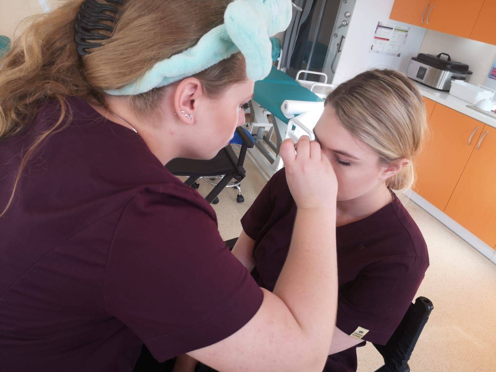 Zajęcia praktyczne studentek 1 roku "Kosmetologia pielegnacyjna" i nauka wykonywania henny brwi z mgr Dominiką Lewczuk