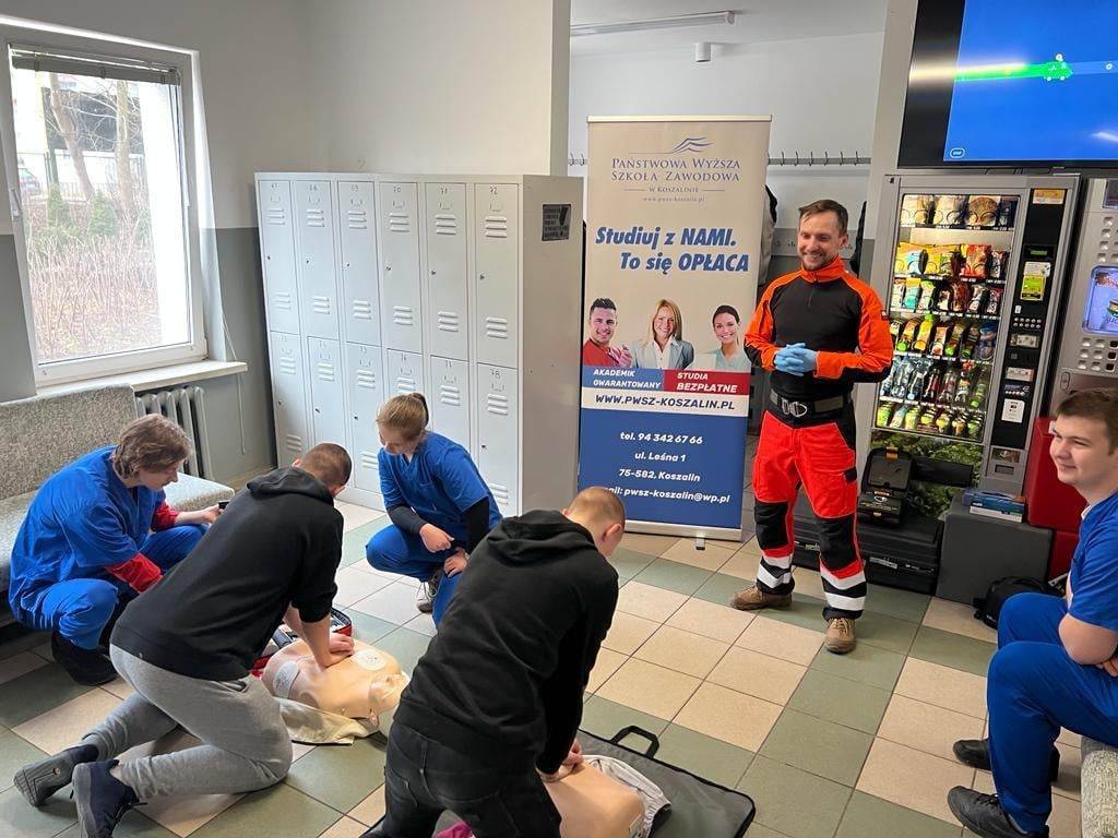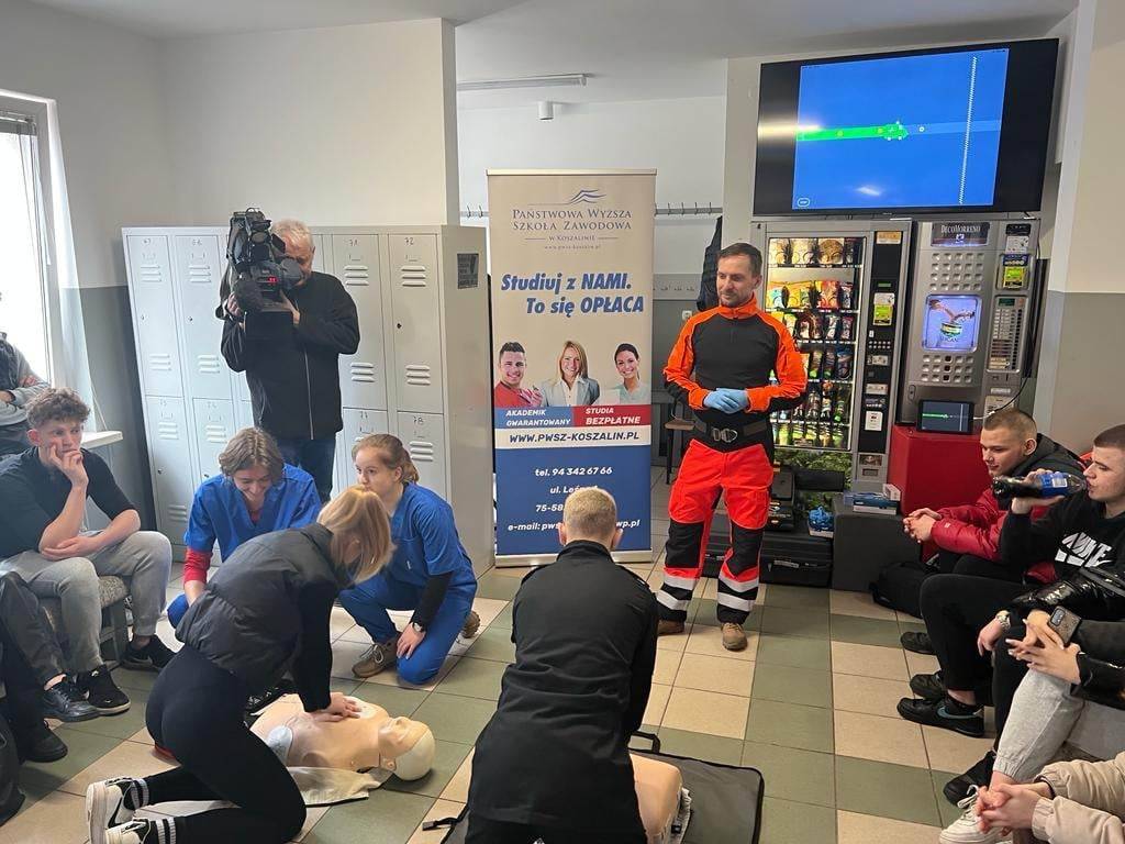 Studenci kierunku #RatownictwoMedyczne z wykładowcą mgr Jarosław Kalenik wzięli udział w akcji realizowanej w TEB Edukacja Koszalin dotyczącej kształcenia młodzieży w zakresie szeroko rozumianego bezpieczeństwa. Studenci przedstawili zasady udzielania pierwszej pomocy przedmedycznej. Uczniowie poznali właściwe techniki oraz mieli możliwość praktycznego zweryfikowania nabytych umiejętności wykonując czynności na fantomie ratowniczym. Pokaz czynności ratowniczych cieszył się dużym zainteresowaniem. Mamy nadzieję, że przyczyni się także do podniesienia poziomu bezpieczeństwa.