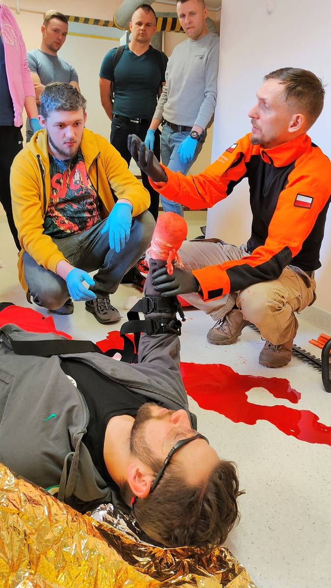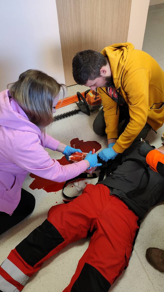 Studenci 3 roku #RatownictwoMedyczne ćwiczą umiejętności praktyczne w ramach zajęć "Medycyna taktyczna" z wykładowcą mgr Jarosław Kalenik. Zainscenizowano amputacje prawej dłoni oraz zastosowanie stazy taktycznej typu SOFT do zaopatrzenia krwotoku. Studenci mieli za zadanie zabezpieczyć amputowaną dłoń oraz wdrożyć działania ratownicze z ewakuacją włącznie.
