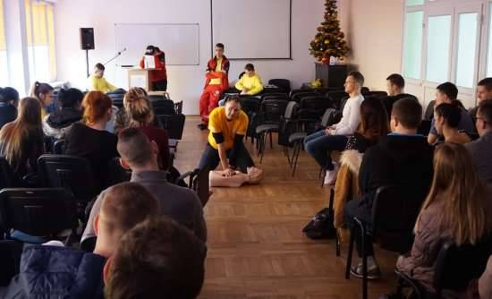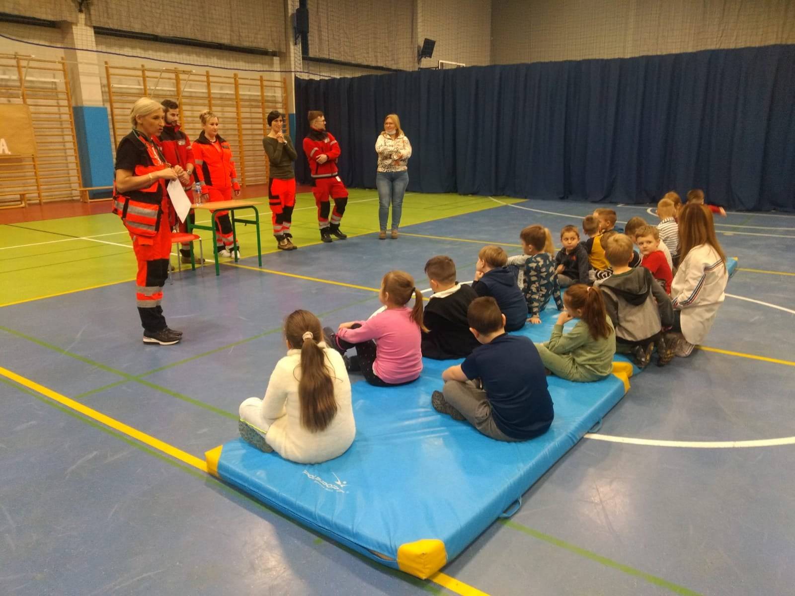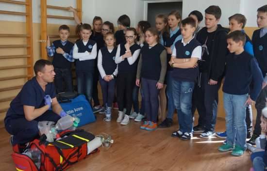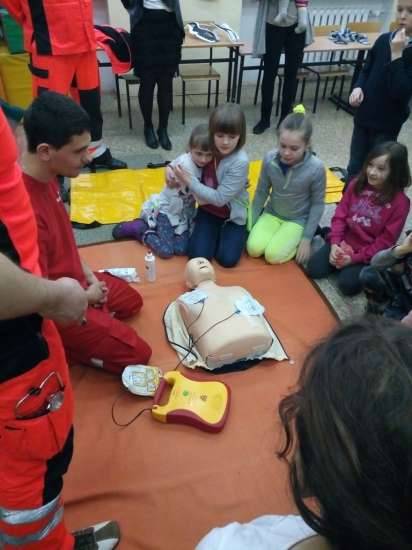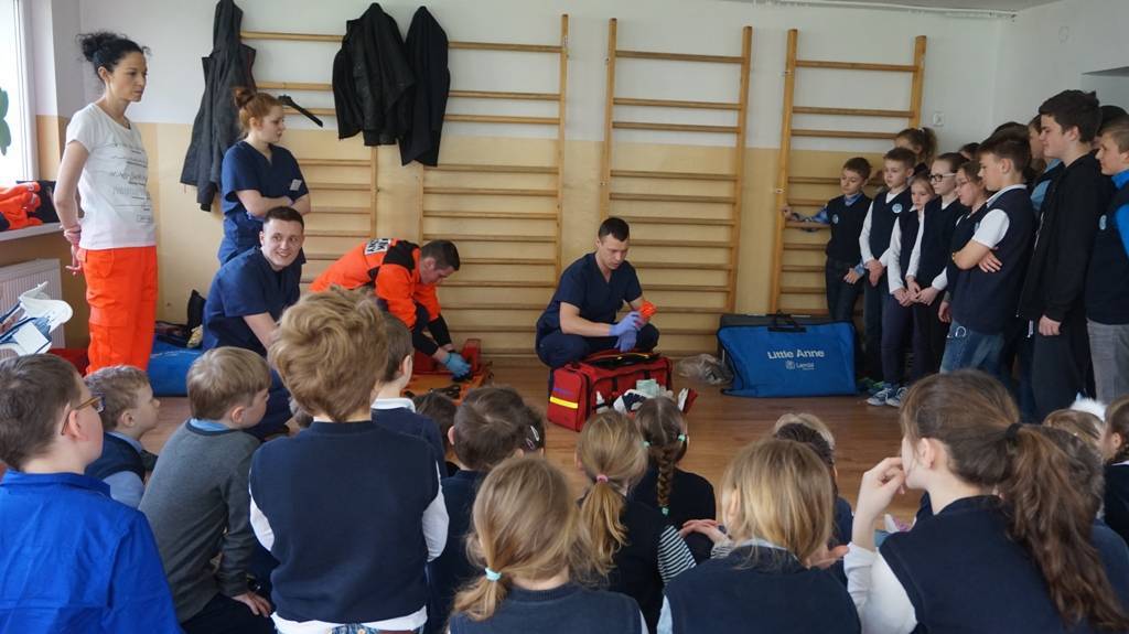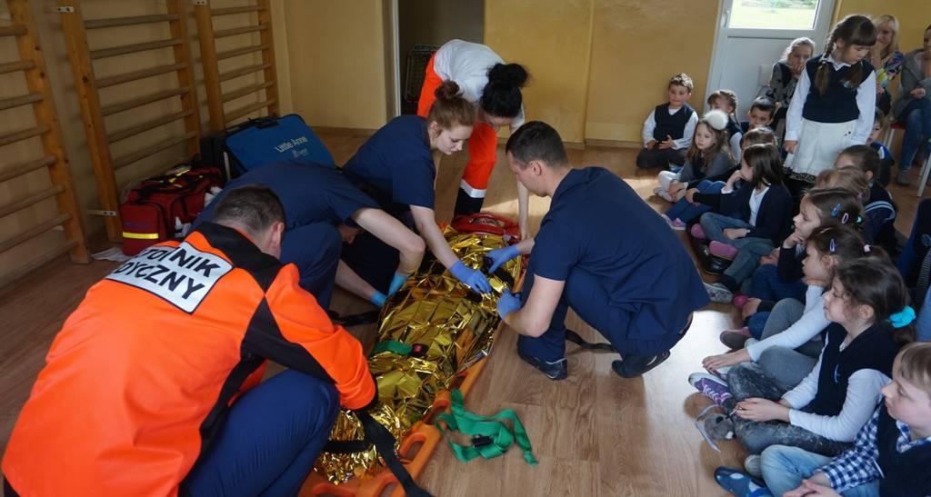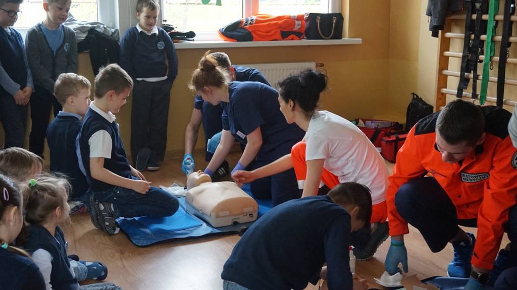 Studenci zapoznali uczniów klas 1-3 z podstawowymi informacjami dotyczącymi prawidłowego zachowania w sytuacjach zagrażających życiu. Przedstawili zasady właściwego ułożenia osoby poszkodowanej oraz powiadamiania służb ratunkowych. Uczniowie poznali także sposoby opatrywania ran. Dzieci miały możliwość sprawdzenia swoich umiejętności w zakresie udzielania pierwszej pomocy poprzez praktyczne działania z wykorzystaniem fantomów. Ćwiczyły także sprawdzanie czynności życiowych na sobie wzajemnie.