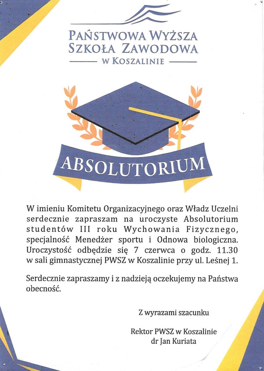 W dniu 1 czerwca 2016 r. w Państwowej Wyższej Szkole Zawodowej w Koszalinie o godz. 10.00 odbyło się uroczyste Absolutorium Menedżerów Sportu 2016. Po raz pierwszy w historii Uczelni dyplomy menedżera sportu i menedżera imprez sportowych otrzymało 30 studentów III roku kierunku wychowanie fizyczne, specjalność menedżer sportu. Absolwenci tej specjalności uzyskują kwalifikacje, które pozwolą im znaleźć zatrudnienie w instytucjach państwowej administracji sportowej, w stowarzyszeniach i klubach sportowych. Kwalifikacje menedżerskie otwierają perspektywę zatrudnienia w jednostkach marketingowych i organizacyjnych w przedsiębiorstwach, w samorządzie terytorialnym i innych instytucjach świadczących usługi w zakresie organizacji imprez. Jednocześnie jako licencjaci kierunku wychowanie fizyczne są przygotowani do wykonywania zawodu nauczyciela wychowania fizycznego. PWSZ w Koszalinie kształcąc na wszystkich kierunkach i specjalnościach w profilu praktycznym, wychodzi naprzeciw oczekiwaniom współczesnego rynku pracy, ułatwia realizacje planów zawodowych młodych ludzi.