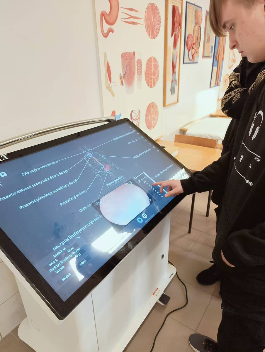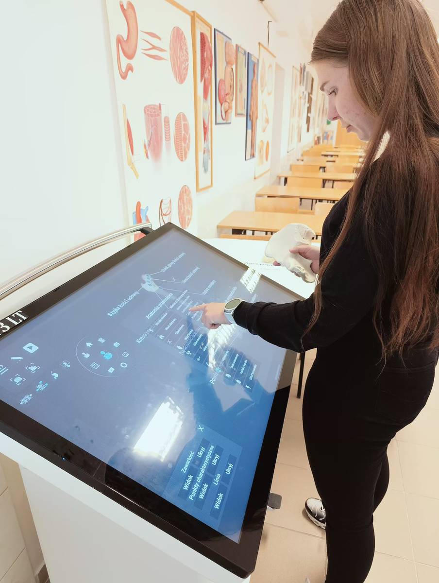 Nowoczesny multimedialny stół anatomiczny z ekranem jest jednym ze specjalistycznego sprzętu zakupionego ze środków MEiN w ramach "Dydaktyczna Inicjatywa Doskonałości", który zawiera szczegółowe obrazy ciała kobiety i mężczyzny.