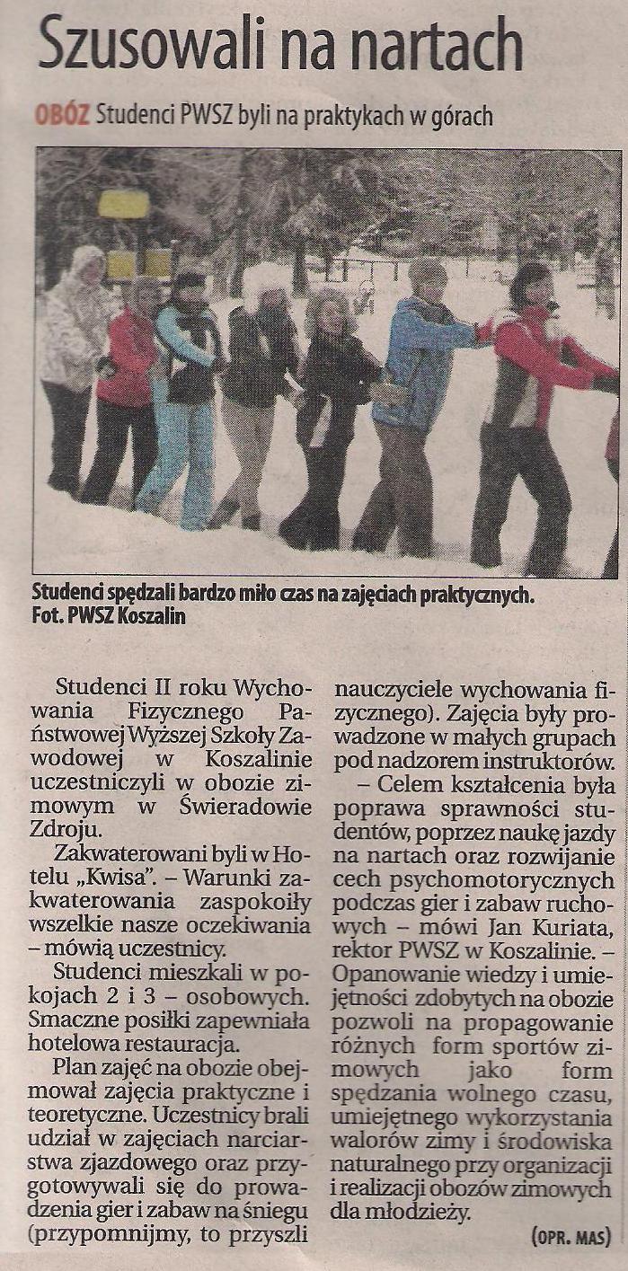 Notatka z lokalnego dziennika "Głos Koszaliński" z dn. 2.03.2012r. "Szusowali na nartach" - Obóz zimowy studentów WF