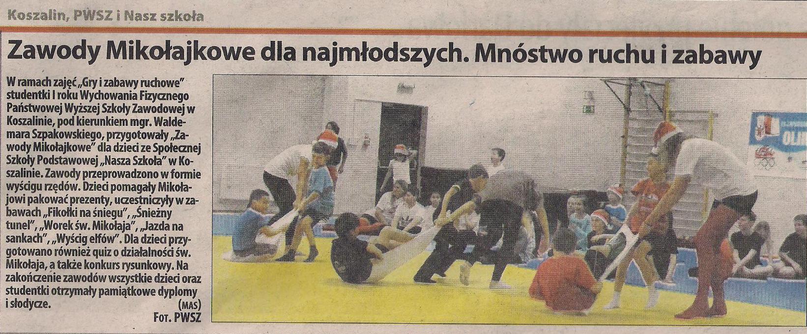 W ramach praktycznej nauki zawodu zajęć Gry i zabawy ruchowe studenci I roku kierunku Wychowanie Fizyczne w dniu 8 grudnia 2014r. przeprowadzili „Mikołajkowe zawody sportowe” dla uczniówSpołecznej Szkoły Podstawowej "Nasza Szkoła". Zawody odbyły się w hali „Gwardii” pod nadzorem prowadzącego zajęcia wykładowcy PWSZ dr. Henryka Kosa oraz kierownika Zakładu Wychowania Fizycznego mgr Waldemara Szpakowskiego.